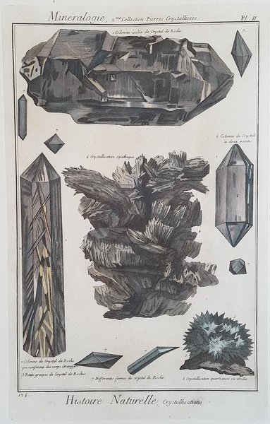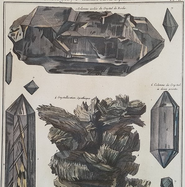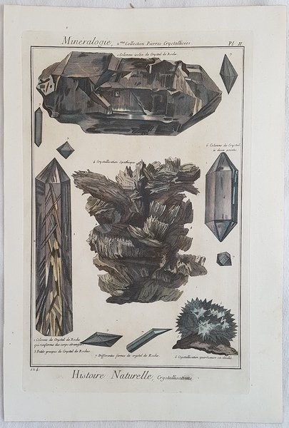 Deliziosa incisione colorata ad acquarello del 1770 circa che mostra delle cristallizzazioni di minerali: colonna isolata di cristallo di rocca, cristallizzazione di Spath, colonna di quarzo. Grandi dimensioni. Atlante: Diderot et d’Alembert – Encyclopedie – Livorno, 1770-1778 Data: 1770 circa Tecnica: incisione a bulino acquarellata a mano Dimensione della pagina: 41x27,5 cm Dimensione dell'incisione: 35,5x22,5 cm Condizioni: ottime. Qualche fioritura Nice print of 1770’s featuring some cristallization of minerals coloured with aquarello by hand. The minerals: column of Rock Crystal, crystal of Spath, columns of quartz. Big size. Atlas: Diderot et d’Alembert – Encyclopedie – Livorno, 1770-1778 Date: 1770 circa Technique: burin engraving Leaf Dimension: 41x27,5 cm (16.1x10.8 inches) Engraving Dimension: 35,5x22,5 cm (14x8.9 inches) Conditions: Very good conditions.