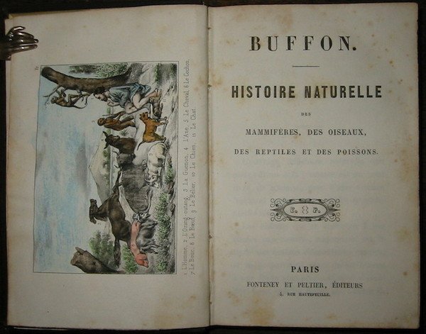 12mo (cm. 16), VI-356 pp., 1 c.nn. (catalogo editoriale). Con 8 tavv. litografiche finemente acquarellate da mano coeva f.t. (di cui una in antiporta). Legatura editoriale in piena tela con ricchi decori in oro ai piatti e titolo ed impressioni a secco al ds. Lievi, marginali fioriture ma ottimo esemplare. Non comune riduzione dell’opera del Buffon ad uso della gioventù.