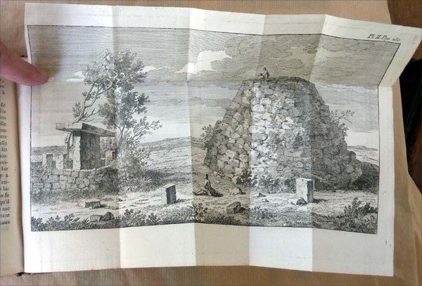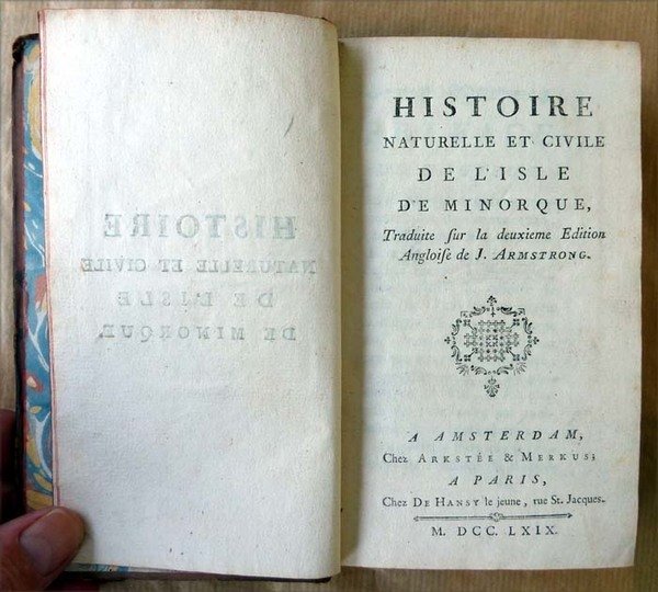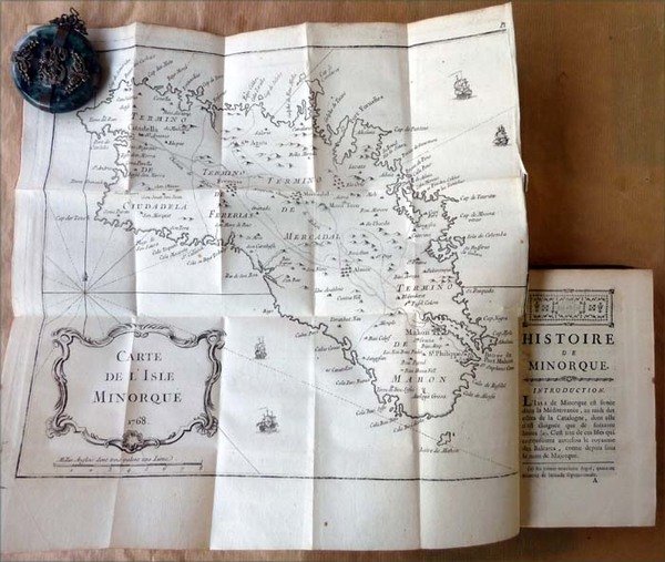 Un volume de format in 12 de XIV pp. (faux titre, titre, préface de l'auteur); une grande carte dépliante de l'île de Minorque à l'époque; 288 pp.; deux belles planches dépliantes dans le texte. Reliure de l'époque en pleine basane marbrée; dos à 5 nerfs, caissons ornés et dorés, titre doré. Coiffe supérieure usée; quelueq taches et épidermures sur les plats; coins usés; tranches rouges. Intérieur et planches frais. Bon exemplaire, mérite une restauration. Voir les photos.