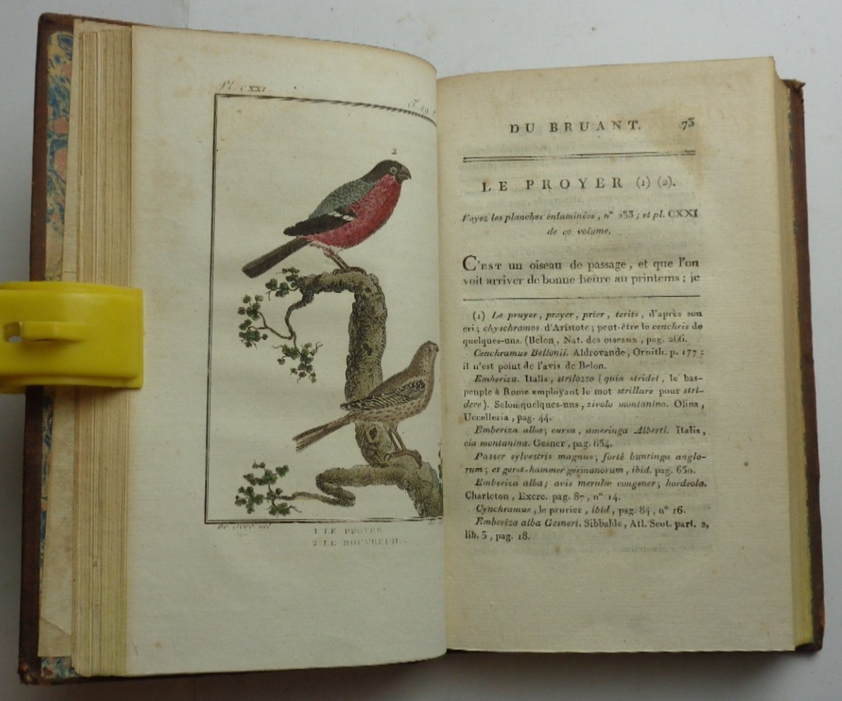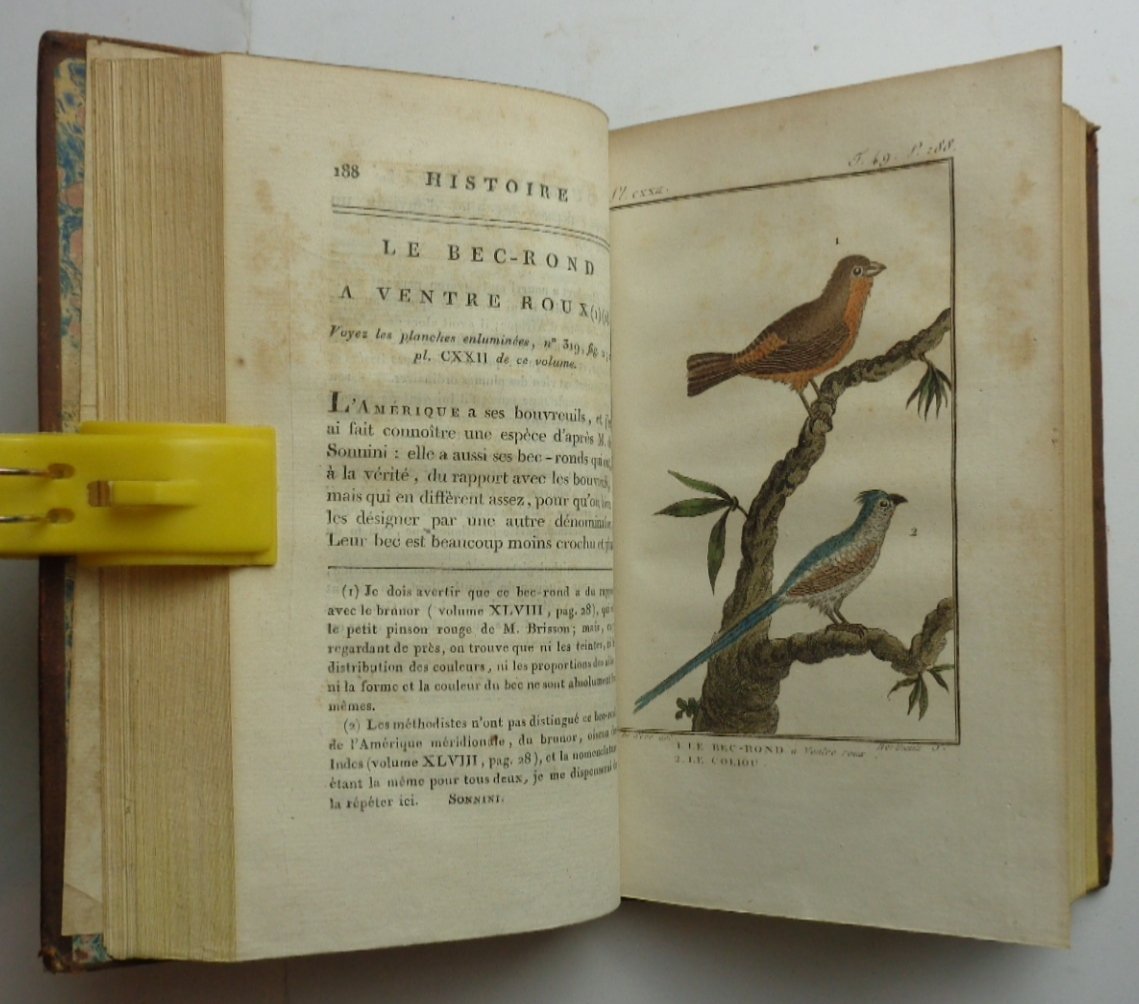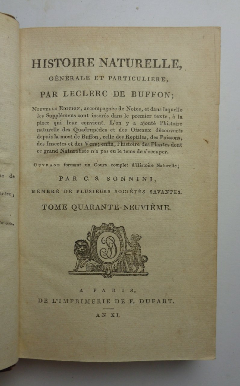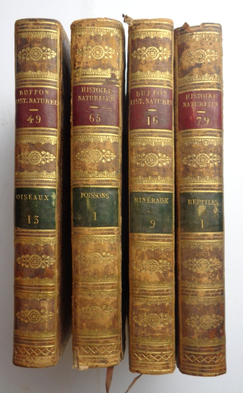 .nouvelle edition, accompagnée de notes et dans laquelle les supplémens sont insérés dans le premier texte, à la place qui leur convient. L'on y a ajouté l'histoire naturelle des quadrupèdes et des oiseaux découverts depuis la mort de Buffon, celle des reptiles, des poissons, des insectes et des vers; enfin, l'histoire des plantes, dont se grand naturaliste n'a pas eu le tems de s'occuper. Ouvrage formant un cours complet d'Histoire naturelle redigé par C.S. Sonnini. 127 volumi (12,5x20 cm) in bella legatura coeva in piena pelle marmorizzata, cornice dorata ai piatti, dorso liscio ornato e dorato con doppio tassello di titolo e tomagione. --Un volume con rilegatura rifatta a imitazione, alcune cuffie mancanti o altri segni d'uso e del tempo ai margini e agli angoli. Risguardie marmorizzate, testimoni. Set completo di questa famosa edizione, con 1113 tavole quasi tutte colorate a mano e carte geografiche, più circa 30 schemi di classificazione e tabelle. Qualche brunitura a macchia o fioriture, ma bell'insieme di questa monumentale riedizione e aggiornamento dell'opera di Buffon. L'opera è così divisa: Théorie de la terre, 3 tomes; Epoques de la Nature, 1 tome; Histoire des Minéraux, 12 tomes; Des Animaux, 1 tome; De l'Homme, 4 tomes; Quadrupèdes, 13 tomes; des Singes, 2 tomes; des Oiseaux, 28 tomes; Crustacés et Insectes, 14 tomes; Mollusques, 6 tomes; Reptiles, 8 tomes; Plantes, 18 tomes; Poissons, 14 tomes; Tables analytiques, 3 tomes. Non tutte le tavole sono numerate, e a volte non sono in sequenza, ma corrispondono al testo.Oltre al testo classico di Buffon sono assai importanti le integrazioni sulla base delle nuove scoperte scientifiche. Rettili e anfibi sono opera del Dudin, con 100 tavole; i molluschi sono di Denis de Monfort, con 72 tavole; uccelli e pesci sono sviluppati dal Sonnini; gli insetti da Latrelle. In sostanza, i migliori studiosi degli anni a cavallo tra 7 e 8cento furono partecipi dell'opera, rara da trovare così completa e in belle condizioni esterne.