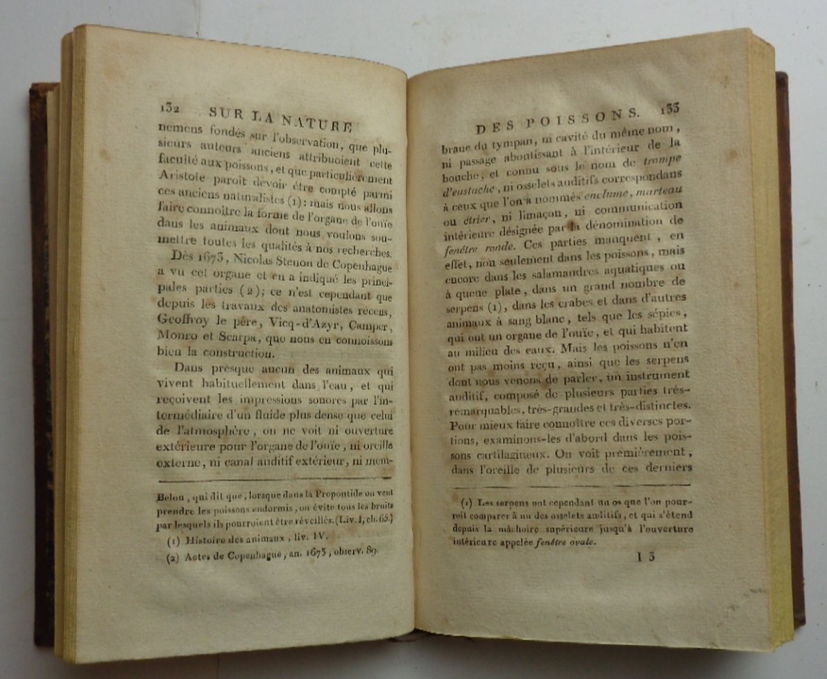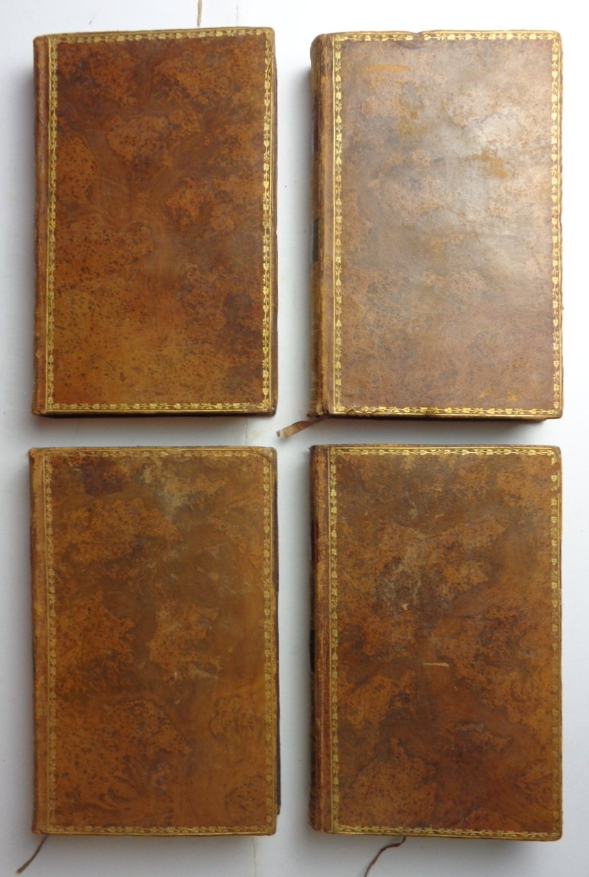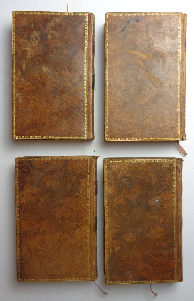 .nouvelle edition, accompagnée de notes et dans laquelle les supplémens sont insérés dans le premier texte, à la place qui leur convient. L'on y a ajouté l'histoire naturelle des quadrupèdes et des oiseaux découverts depuis la mort de Buffon, celle des reptiles, des poissons, des insectes et des vers; enfin, l'histoire des plantes, dont se grand naturaliste n'a pas eu le tems de s'occuper. Ouvrage formant un cours complet d'Histoire naturelle redigé par C.S. Sonnini. 127 volumi (12,5x20 cm) in bella legatura coeva in piena pelle marmorizzata, cornice dorata ai piatti, dorso liscio ornato e dorato con doppio tassello di titolo e tomagione. --Un volume con rilegatura rifatta a imitazione, alcune cuffie mancanti o altri segni d'uso e del tempo ai margini e agli angoli. Risguardie marmorizzate, testimoni. Set completo di questa famosa edizione, con 1113 tavole quasi tutte colorate a mano e carte geografiche, più circa 30 schemi di classificazione e tabelle. Qualche brunitura a macchia o fioriture, ma bell'insieme di questa monumentale riedizione e aggiornamento dell'opera di Buffon. L'opera è così divisa: Théorie de la terre, 3 tomes; Epoques de la Nature, 1 tome; Histoire des Minéraux, 12 tomes; Des Animaux, 1 tome; De l'Homme, 4 tomes; Quadrupèdes, 13 tomes; des Singes, 2 tomes; des Oiseaux, 28 tomes; Crustacés et Insectes, 14 tomes; Mollusques, 6 tomes; Reptiles, 8 tomes; Plantes, 18 tomes; Poissons, 14 tomes; Tables analytiques, 3 tomes. Non tutte le tavole sono numerate, e a volte non sono in sequenza, ma corrispondono al testo.Oltre al testo classico di Buffon sono assai importanti le integrazioni sulla base delle nuove scoperte scientifiche. Rettili e anfibi sono opera del Dudin, con 100 tavole; i molluschi sono di Denis de Monfort, con 72 tavole; uccelli e pesci sono sviluppati dal Sonnini; gli insetti da Latrelle. In sostanza, i migliori studiosi degli anni a cavallo tra 7 e 8cento furono partecipi dell'opera, rara da trovare così completa e in belle condizioni esterne.