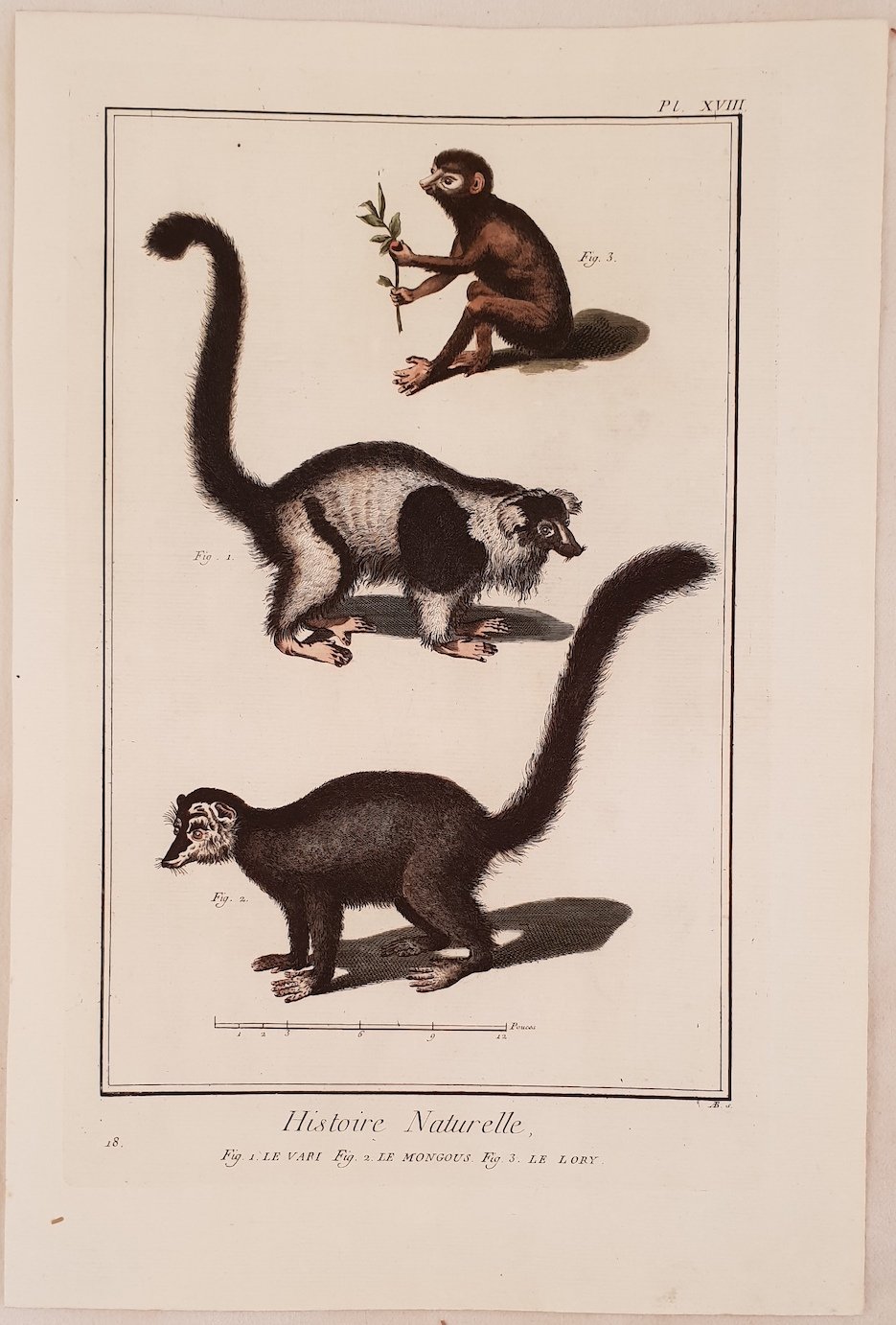 Deliziosa incisione colorata ad acquarello del 1770 circa che mostra un loris, la mangusta e un lemure. Grandi dimensioni. Autore: Antonio Baratti (1724-1787) Atlante: Diderot et d’Alembert – Encyclopedie – Livorno, 1770-1778 Data: 1770 circa Tecnica: incisione a bulino acquarellata a mano Dimensione della pagina: 40,5x27 cm Dimensione dell'incisione: 35,5x22 cm Condizioni: ottime. Qualche fioritura Segno di tarlo al margine inferiore Nice print of 1770’s featuring the loris,mongoose, lemur coloured with aquarello by hand. Big size. Author: Antonio Baratti (1724-1787) Atlas: Diderot et d’Alembert – Encyclopedie – Livorno, 1770-1778 Date: 1770 circa Technique: burin engraving Leaf Dimension: 40,5x27 cm Engraving Dimension: 35,5x22 cm Conditions: Very good conditions. Worming in the lower edge