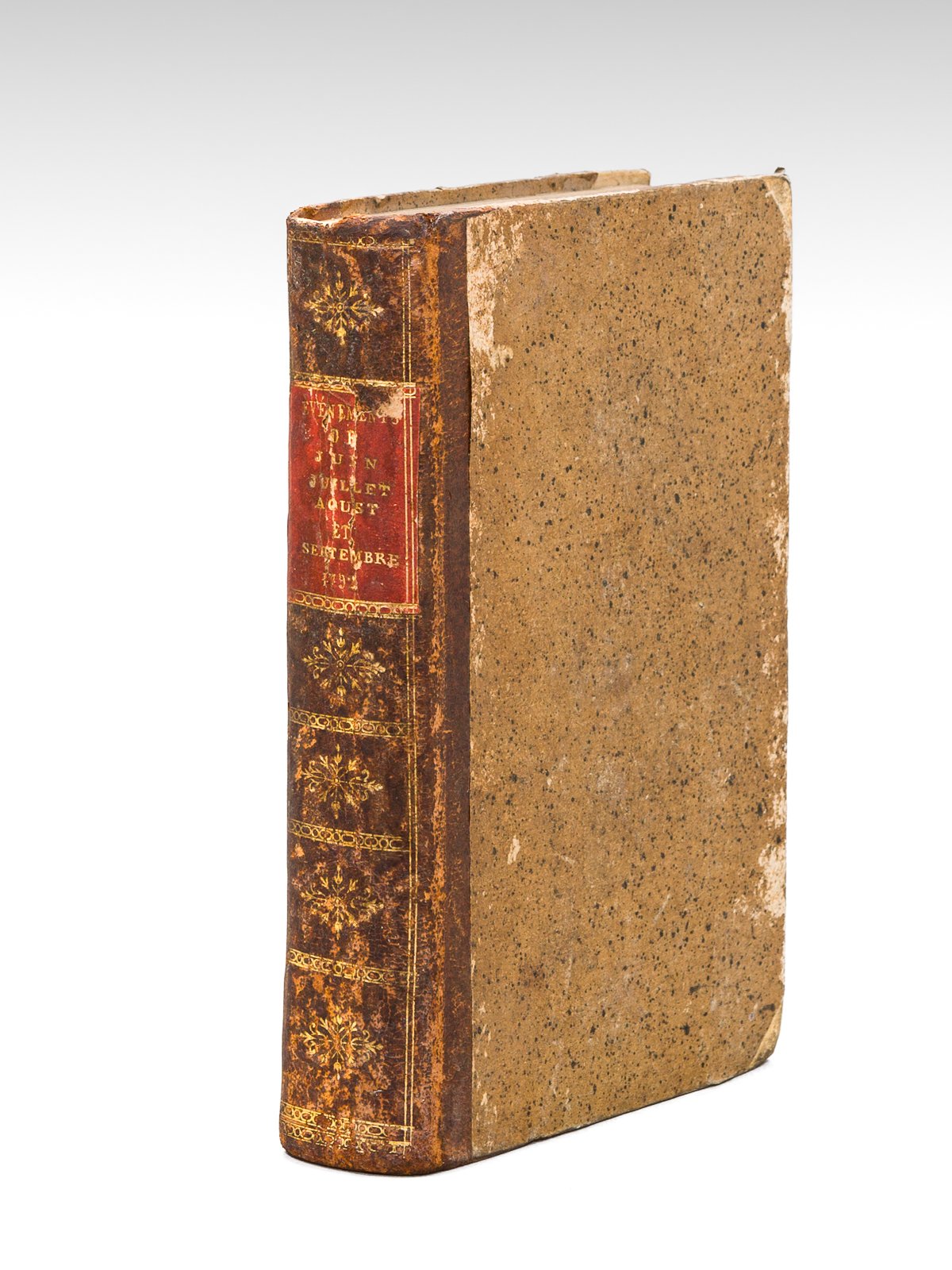 Histoire Particulière des Evènements qui ont eu lieu en France, pendant les mois de Juin, Juillet, d'Août et de Septembre 1792, et qui ont opéré la Chute du Trône Royal, Chez Périsse et Compère, Léopold Collin, Paris, 1806, 2 ff., 541 pp. [ Suivi de : ] L'Agonie de Saint-Lazare, sous la Tyrannie de Robespierre, par J.F.N. Dusaulchoy, Chez Chabal, Paris, s.d. [circa 1794 ], 2 ff., 52 pp. Dans le premier ouvrage l'avocat Maton de La Varenne fournit la liste des prisonniers de Paris massacrés dans leurs geôles, ainsi que celle des auteurs et instigateurs des massacres. L'ouvrage est suivi de la très rare édition originale de "L'Agonie de Saint-Lazare, sous la Tyrannie de Robespierre" dans laquelle Joseph Dusaulchoy relate son emprisonnement sous la Terreur, les massacres et la libération à la chute de Robespierre. Etat très satisfaisant (reliure frottée avec petits mq. en coiffe sup., bon état par ailleurs, ex-libris en garde).