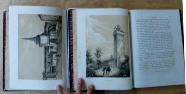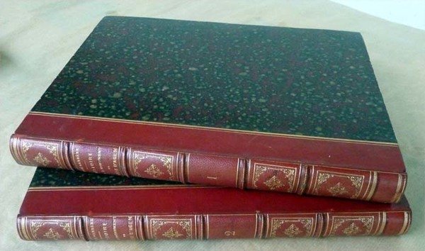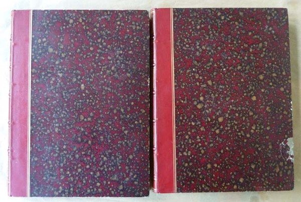 Ensemble de deux volumes de format in folio de pour le Tome Ier: XII pp. (faux titre, titre, autorisations, préface); 392 pp.; 5 planches lithographiées de détail de chapiteaux etc. et 8 planches hors-texte lithographiées en deux couleurs. Pour le Tome second: 2 ff. (faux titre et titre); 440 pp.; une 6ème planche en noir de détails en fin; et 5 planches hors-texte lithographiées en deux couleurs. Reliure de l'époque en dmi chagrin cerise; dos à 5 nerfs; caissons ornés et dorés; titres dorés. Légère mouillure à la planche en noir N°6 du tome 2; au même tome traces d'écrasement sur les coupes. Voir les photos. Intérieur bien frais. Charmant exemplaire, souvent incomplet. Ici figurent bien les 13 lithographies en deux teintes et les 6 en noir.