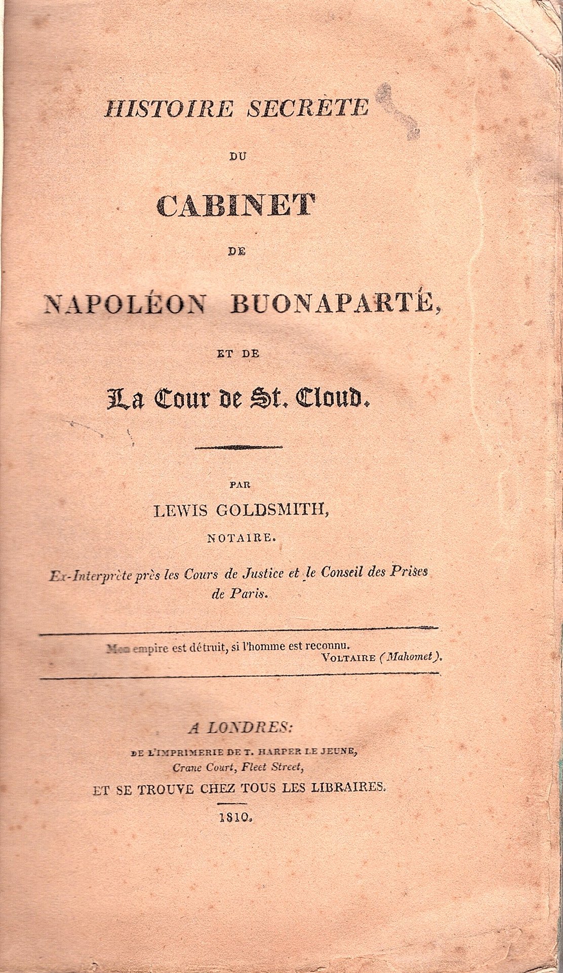 In-8°, pp. XXXVI, 443 + LXXXIV, 139 di appendici autonamente numerate, brossura marmorizzata caillouté ottocentesca. Fioriture e bruniture diffuse, ma buon esemplare in barbe. Prima edizione francese di quest'opera pubblicata all'origine a Londra nello stesso 1810 e dovuta alla penna di Lewis Goldsmith, notaio ed ex interprete alla parigina Corte di Giustizia e al Consiglio delle Prede, scrittore politico e giornalista vissuto tra il 1763 e il 1846. Scrittura fieramente antinapoleonica ed antifrancese, intesa a demolire la Rivoluzione dell'89 e la figura di Bonaparte, essa risulta di estremo interesse per contestualizzare le reazioni pubblicistiche alla Rivoluzione e all'avanzare, in un momento successivo, della dominazione napoleonica. 'Il principale oggetto, che ho avuto in vista, è stato il provare per mezzo di un ragguaglio di fatti poco noti, e peggio apprezzati, che, nell'attuale stato dell'Europa, il Governo Inglese non può far la pace con Buonaparte senza compromettere la sua sicurezza', scrive il Goldsmith nella sua prefazione. Pubblicista anglo-francese con sangue portoghese ed ebreo nelle vene, il Goldsmith aveva dato alle stampe nel 1801 'The Crimes of Cabinets, or a Review of the Plans and Aggressions for Annihilating the Liberties of France, and the Dismemberment of her Territories', attacco contro la politica di Pitt che lo indusse a trasferirsi nel 1802 a Parigi. Talleyrand lo presentò a Napoleone, che gli affidò la direzione di un giornale in inglese stampato però a Parigi, mirante a trattare le vicende inglesi sotto un'ottica prettamente francese.