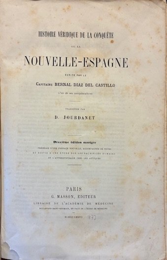 Histoire veridique de la conquete de la Nouvelle-Espagne. Traducion par D. Jourdanet. Deuxieme edition corrigée