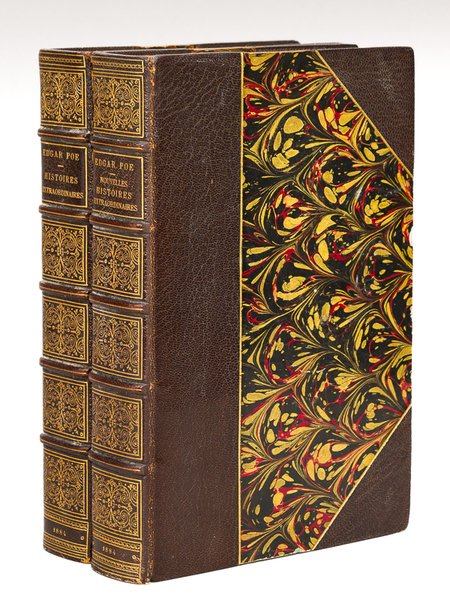 Traduites par Charles Baudelaire, édition illustrée de treize [ et treize ] gravures hors texte, 2 vol. petit in-8 reliure demi-maroquin à coins chocolat, dos à 5 nerfs dorés richement orné, filet doré en mors et coins, tête dorée, couvertures et dos conservés, date en queue, reliure signée de Durvand, A. Quantin, Paris, 1884, XXXII-382 pp. et 1 f. n. ch. ; XXIV-287 pp. avec 26 gravures hors texte Premières éditions illustrées de la traduction des "Histoires" et "Nouvelles Histoires" par Charles Baudelaire. Chaque volume est illustré de 13 gravures, soit au total 26 planches hors texte dont 20 eaux-fortes et 6 héliogravures. Bon état (mors et coupes un peu frottés, qq. rouss., bon exemplaire par ailleurs) pour ces exemplaires reliés par Durvand. Vicaire, VI, 735-736