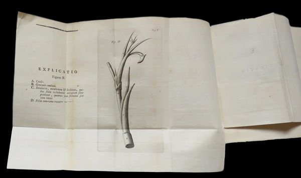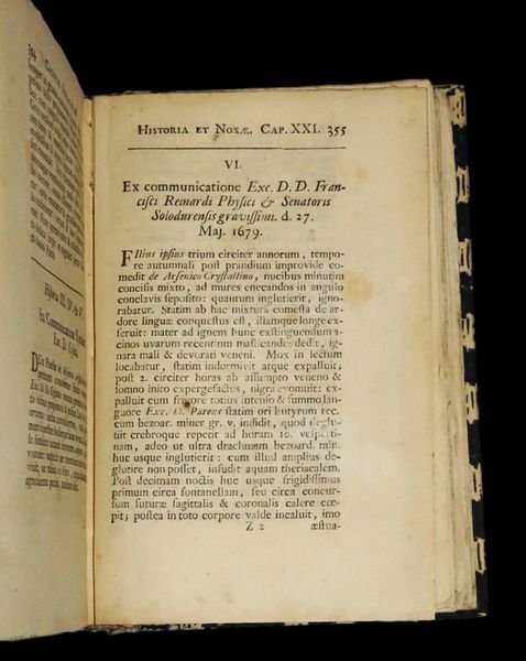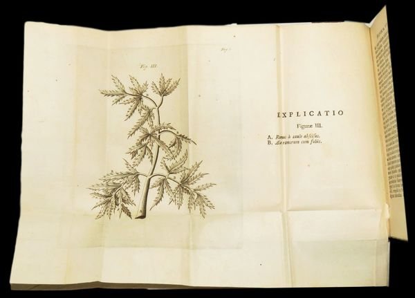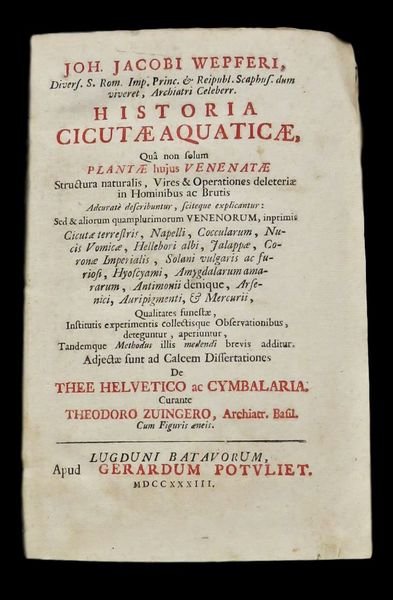 In 8° (16,7x10,7 cm); (16), 482, (14) pp. e 6 tav. f.t., di cui 5 più volte ripiegate, incise su rame. Elegante legatura degli inizi del XX° secolo in cartoncino a motivi floreali in blu scuro e bianco e titolo in oro su fascetta al dorso. All'interno esemplare in perfetto stato di conservazione e ancora in barbe. Frontespizio in rosso e nero. Edizione più completa fra quelle uscite e non comune, di questa importante opera di interesse botanico, medico e farmacologico. Opera illustrata da 6 tavole, 5 a carattere botanico e una con due tavole in una carta: veduta di Donaueschingen la città tedesca nella parte sud-occidentale dello stato del Baden-Württemberg dove i fiumi Breg e Brigach si uniscono per formare il Danubio e una cartina entro cornice animata della stessa parte della Germania. L'opera contiene anche la Dissertatio medica de thee Elvetico (da c. 2D4r) e la Dissertatio de cymbalaria (da c. 2F6r). Johann Jakob Wepfer (23 dicembre 1620 - 26 gennaio 1695) fu un celebre patologo e farmacologo svizzero nativo di Schaffhausen. Studiò medicina a Strasburgo, Basilea e Padova, e nel 1647 tornò nella sua città natale per praticare l'arte medica. Fu anche un medico della famiglia reale. Wepfer è ricordato per il suo lavoro sull'anatomia vascolare del cervello, e i suoi studi sulle malattie cerebrovascolari. Fu il primo medico ad ipotizzare che gli effetti IMG_0138_clipped_rev_1di un ictus fossero il risultato di sanguinamenti del cervello. Arrivò anche ad ipotizzare che i sintomi dell'ictus potevano essere causati anche da un blocco di una delle arterie che normalmente forniscono sangue al cervello. Da studi post-mortem, ottenne importanti informazioni sulle arterie carotidee e vertebrali. Nel 1658 pubblicò un trattato che divenne presto un classico l'"Historiae apoplecticorum". Wepfer diede importanti contributi anche nel campo della farmacologia sperimentale e tossicologia. Condusse importanti esperimenti sulla tossicità della cicuta, dell'Helleborus e l'Aconitum mettendo in guardia anche contro l'uso dell'arsenico, dell'antimonio e del mercurio in medicina. Nel campo della farmacologia / tossicologia pubblicò nel 1679 questo lavoro qui presentato sulla cicuta e su altri numerose sostanze e piante velenose utilizzate in medicina che divenne ben presto un testo basilare per la storia della farmacologia e della medicina moderna. Bibl.: Haller I, 602; Seguier pt. 1, 210; Pretzel N. 10186. Modern binding but very good copy.