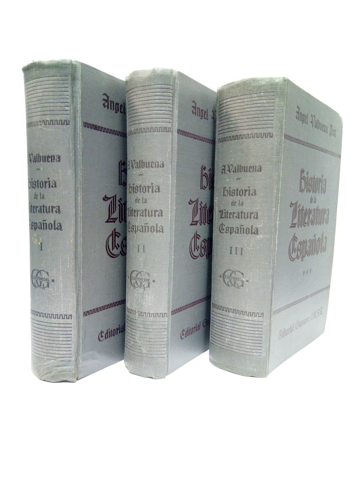 3ª. Ed., corregida y aumentada.- Barcelona: Ed. Gustavo Gili, 1950.- 3 VOLS. ([2 h.], 817 p., [1 h.]; [2 h.], 687 p.; [2 h.], 909 p., [1 h.]); 4º (23,2 x 15,5 cm); Portada a dos tintas; Tela Ed. Las encuadernaciones con ligeras señales del tiempo, portada y portadilla con discreto sello tampón de una antigua librería y firma del anterior propietario en el margen superior de la portada del tomo I. Se añadió más tarde un tomo IV. con la literatura Hispano-Americana. LITERATURA Y FILOSOFÍA ESPAÑOLAS DE LOS SIGLOS XIX-XXI Y SU HISTORIA EN GENERAL