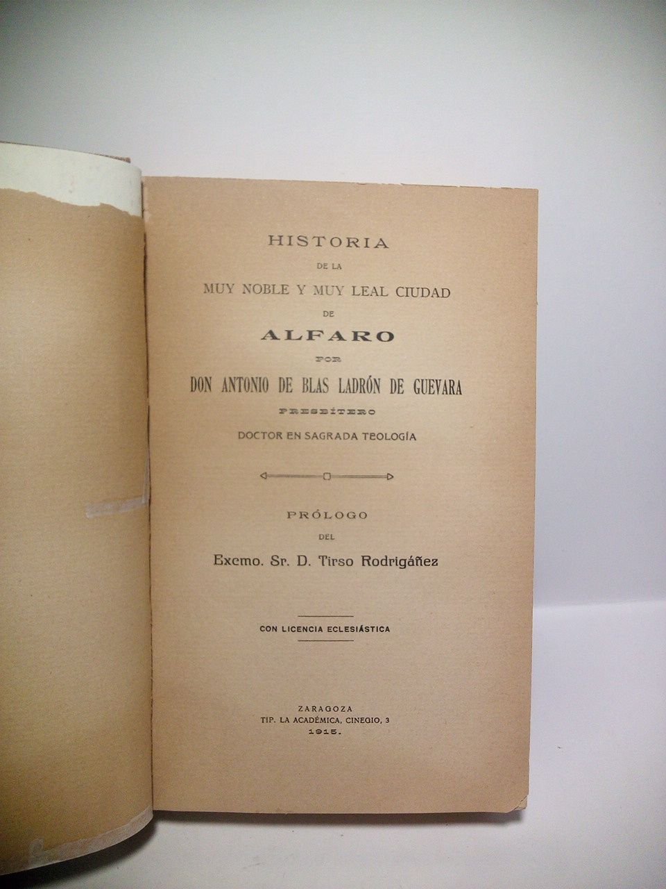 Historia de la muy noble y muy leal Ciudad de ALFARO / Prólogo ddel Excmo. Sr. D. Tirso Rodrigáñez