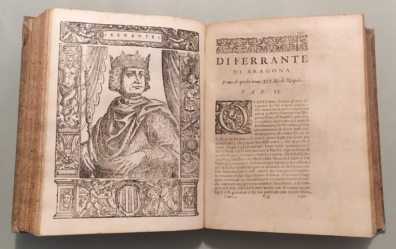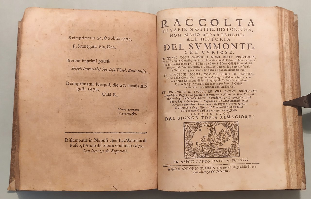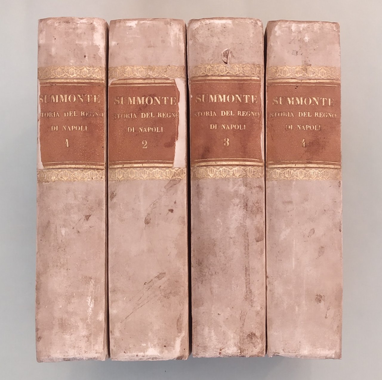 Unito: Loffredo Ferrante. L'Antichità di Pozzuolo et luoghi convincini. Unito: Almagiore Tobia. Raccolta di varie notitie historiche, non meno appartenenti all'historia del Summonte che curiose contengono i nomi delle Provincie, Città, Terre e Castella... In Napoli, a spese di Antonio Bulifon, 1675. Quattro volumi in 8vo; cc.18 n.nn., pp.490; 6n.nn., 38; cc.14n.nn., pp.652; cc.14n.nn., pp.558; cc.14 n.nn., pp.479; 8n.nn., 122, 5n.nn. Insegne tipografiche ai frontespizi, 39 tavole con ritratti e tavole genealogiche. Qualche traccia d'umido. Mezza pergamena coeva, tassello con titolo e fregi in oro ai dorsi. Autori Italiani del '600, 901: "Rara a trovarsi completa tutta l'opera"; Lozzi, 2970; Cat. Platneriana, pag.234; Giustiniani, Biblioteca Storica e Topografica del Regno di Napoli, pag.109.