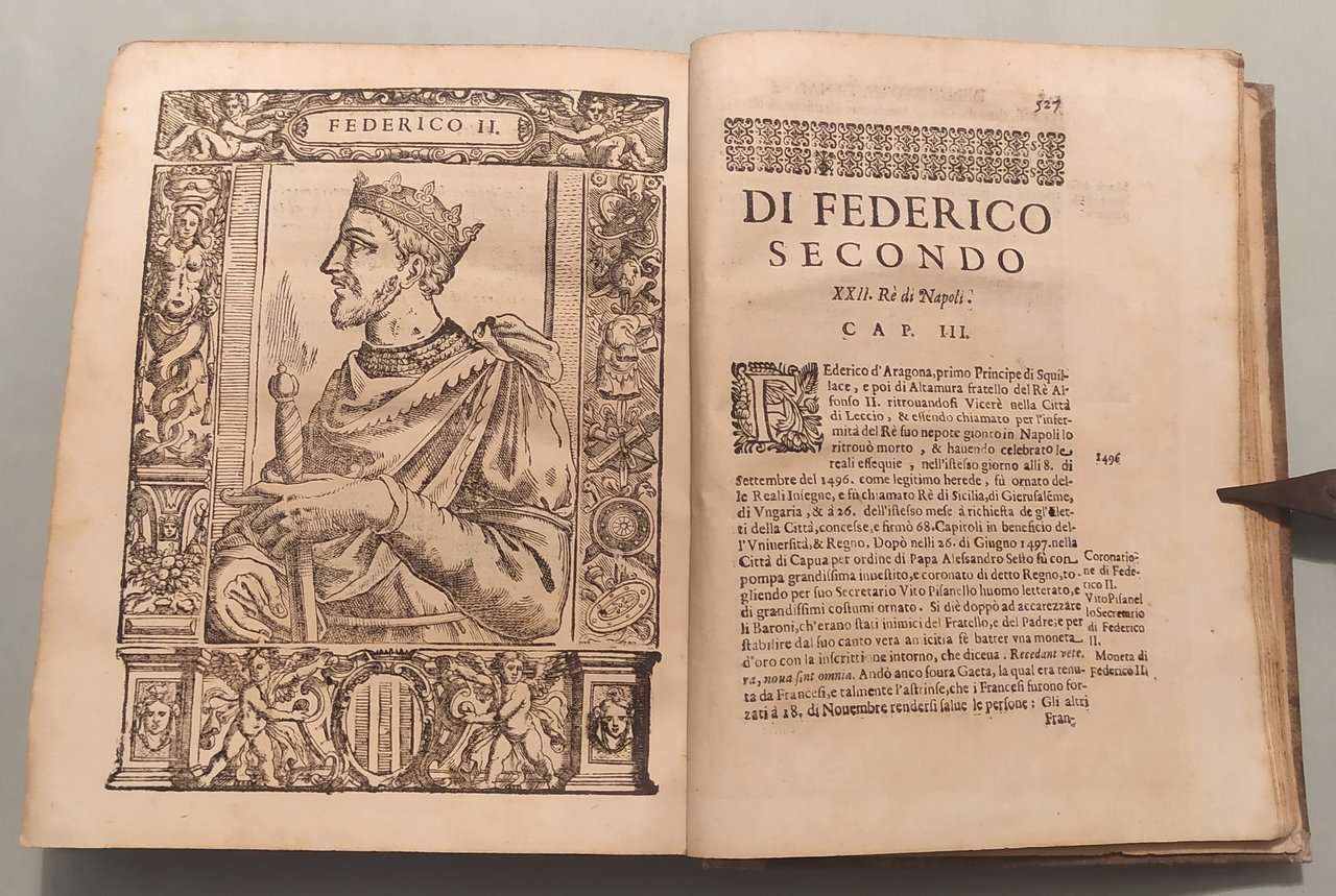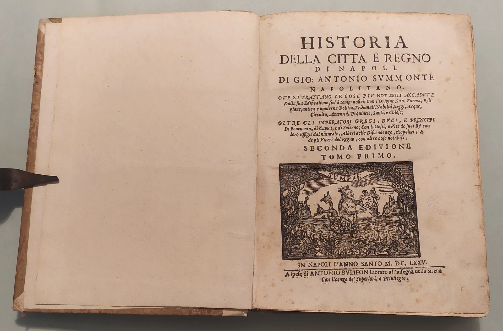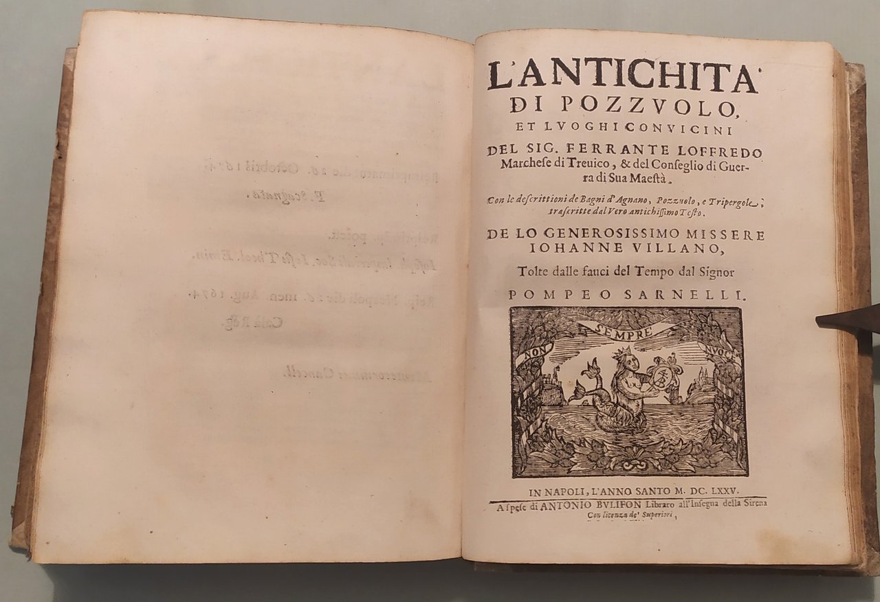 Unito: Loffredo Ferrante. L'Antichità di Pozzuolo et luoghi convincini. Unito: Almagiore Tobia. Raccolta di varie notitie historiche, non meno appartenenti all'historia del Summonte che curiose contengono i nomi delle Provincie, Città, Terre e Castella... In Napoli, a spese di Antonio Bulifon, 1675. Quattro volumi in 8vo; cc.18 n.nn., pp.490; 6n.nn., 38; cc.14n.nn., pp.652; cc.14n.nn., pp.558; cc.14 n.nn., pp.479; 8n.nn., 122, 5n.nn. Insegne tipografiche ai frontespizi, 39 tavole con ritratti e tavole genealogiche. Qualche traccia d'umido. Mezza pergamena coeva, tassello con titolo e fregi in oro ai dorsi. Autori Italiani del '600, 901: "Rara a trovarsi completa tutta l'opera"; Lozzi, 2970; Cat. Platneriana, pag.234; Giustiniani, Biblioteca Storica e Topografica del Regno di Napoli, pag.109.
