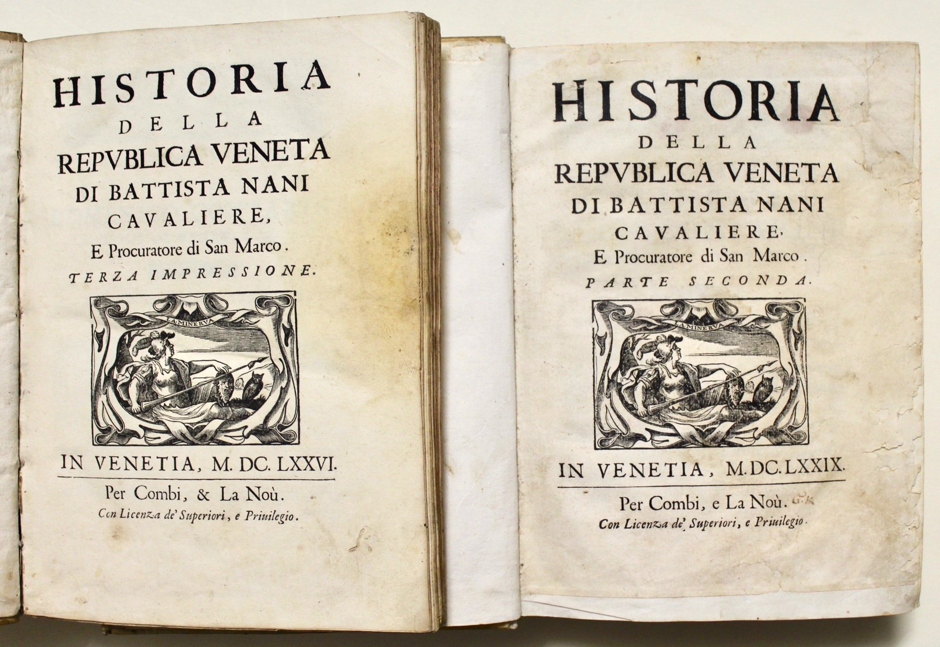 2 voll. in 4° grande (mm 265x192); pagg. 8 n.n., 895, 21 n.n.; 10 n.n., ritratto dell'autore inciso in rame, 736, 40 n.n. Vignette ai frontespizi in silografia rappresentanti Minerva. Testatine con fregi e iniziali ornate all'inizio di ogni libro. Dediche ai rispettivi tomi ai principi Domenico Contarini e Luigi Contarini. Legature settecentesche in tutta pergamena con titolo in oro su tassello ai dorsi (tassello del secondo tomo mancante) tagli rossi spruzzati. L'autore, Cavaliere e Procuratore di S. Marco, tratta della storia di Venezia dal 1613 al 1671. Terza edizione della prima parte; l'opera fu poi sospesa per un obbligazione pubblica imposta all'autore. La continuazione termina nel 1671 con la pace della Repubblica con i Turchi, due anni dopo la perdita di Candia. Lo storico Giovan Battista Nani (1616 - 1678) patrizio veneziano, fu bibliotecario e archivista, procuratore di S. Marco; per 25 anni ambasciatore di Venezia in Francia. <BR>Buon esemplare con saltuari aloni all'inizio ed alla fine del volume I, mentre il vol. II presenta dei difetti ai margini esterni delle prime carte<BR>Lozzi 6072; Piantanida 1038: "Tra le più importanti del secolo, questa storia tratta più dei Francesi in Italia che del resto: fu accolta con interesse, e ne fanno fede le numerose edizioni. L'autore si occupa particolarmente delle guerre in Dalmazia e a Candia."; Cicogna 574; Graesse IV, 644. <BR>