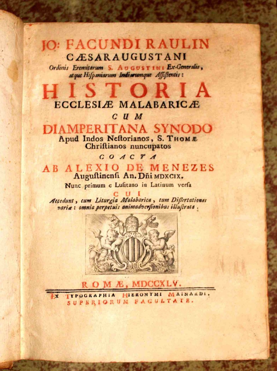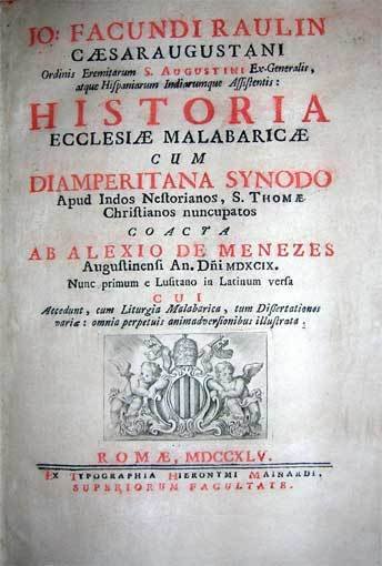 Historia Ecclesiae Malabaricae cum Diamperitana Synodo Apud Indos Nestorianos, S. Thomae Christianos nuncupatos coacta ab Alexio de Menezes Augustinensi An. MDXCIX. Nunc primum e Lusitano in Latinum versa (Jo. Facundi Raulin) cui Accedunt, cum Liturgia Malabarica, tum Dissertationes variae: omnia perpetuis animadversionibus illustrata