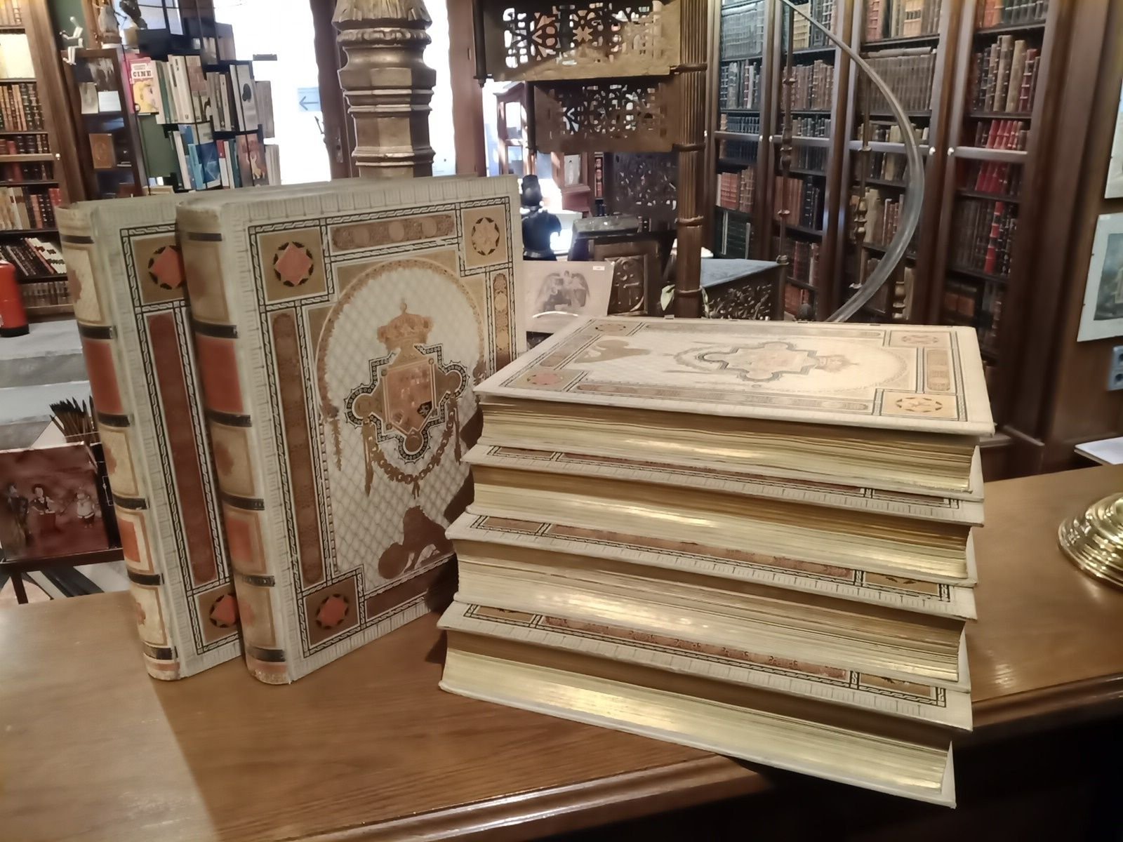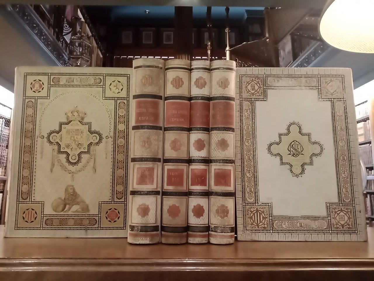 [2ª Tirada de lujo].- Barcelona: Montaner y Simón, Editores, (I.) 1883, (II.) 1883, (III.) 1879, (IV.) 1879, (V) 1880 y (VI) 1882.- 6 VOLS. con [2 h.], XLVI, 547 p. / [2 h.], 661 p., [1 h.] / [2 h.], 593 p. / [2 h.], 458 p., [1 h.] / [2 h.], 621 p., [1 h.] / [2 h.], X, 871 p.; Gran Folio (34,5 x 26 cm): Bellamente ilustrado con preciosas láminas cromolitográficas a todo color, retratos de los reyes de España en láminas grabadas al cobre por Masson, mapas históricos de España a doble página e ilustraciones numismáticas en negro a plena página con las monedas de cada época, abriendo el tomo 1º con el retrato de D. Modesto Lafuente finamente grabado al cobre; Encuadernados en Pleno Pergamino a la romana (tapas duras), con estampaciones en oro y colores en ambas tapas y lomo, cortes dorados.* Este ejemplar se encuentra en muy buen estado, con la encuadernación editorial de lujo. Los años de edición son alternos dado que es en realidad la segunda tirada de esta magna obra, en cuya impresión se aprovecharon tomos de la primera edición que debían de sobrar en la editorial. ESTA EDICION ES MUY BELLA y está absolutamente completa de sus láminas, con el interior impecable. Solamente el Tomo VI tiene una reparación en la primera hoja en blanco o de cortesía, así como en el plano plegado del final, y un pequeño raspón en la base de la tapa anterior de poca importancia. El Tomo I con un pequeño sello tampón en la portada, bajo el pie de imprenta, sin afectar texto. Esta famosa historia de España, aparte de ser una magnífica obra, contiene importante información numismática que en su tiempo fue muy valorada. Modesto Lafuente fue el arquitecto de la historia nacional española, el que vertebró el modo de organizar la historia de España concebida como una nación cuya existencia tenía un arraigo en un territorio peninsular que marcaba la personalidad como pueblo. Hasta Lafuente sólo existía una historia de los reyes, realizada por el padre Mariana al filo del siglo XVII, llena de mitos, fábulas y versiones interesadas de los conflictos dinásticos. Lafuente limpió la historia de todo esto, creando las bases para la moderna historiografía hispánica. HISTORIAS GENERALES DE ESPAÑA Y ENSAYOS SOBRE SU HISTORIA EN GENERAL