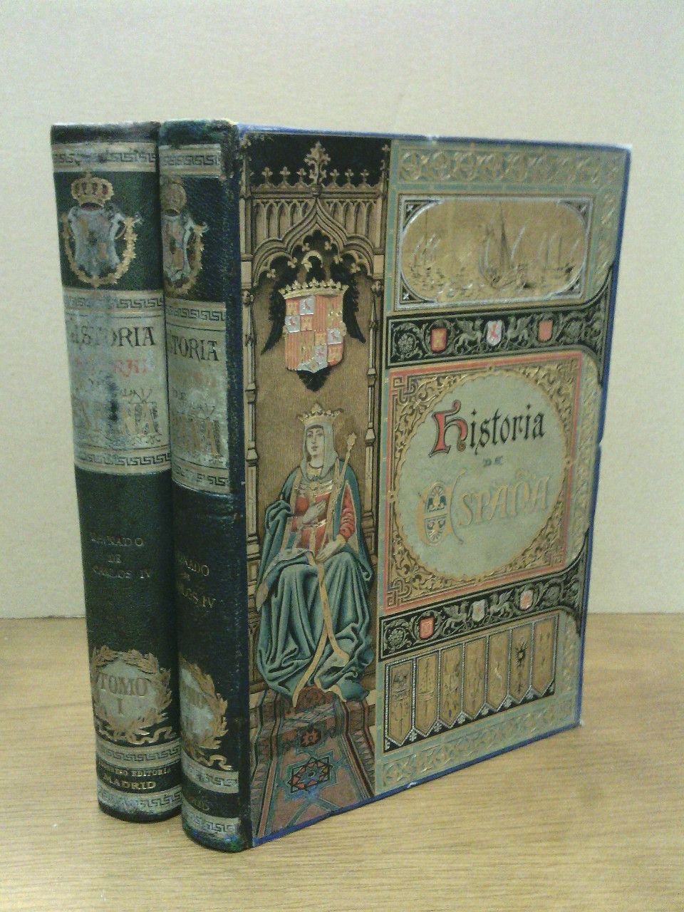 Madrid: El Progreso Editorial, 1893.- Solo Vols. 1 y 2 de 3. ([2 h.], 516 p., [1 h.]; [2 h.], 523 p., [2 h.]): En el tomo 1º tres láminas, con el retrato de Carlos IV, otro igual de Maria Luisa de Borbón y otro de Godoy, bellamente grabados al cobre por Galván a partir de sendos cuadros de Goya, más otros retratos xilograficos. El tomo 2º igualmente ilustrado con láminas xilográficas, con retratos de personajes diversos y una lámina a doble página del combate de Trafalgar; 4º mayor (25,3 x 18 cm.); Media Piel Ed., lomo y planos bellamente estampados en oro y colores, cortes dorados.- (Historia General de España, escrita por individuos de número de la Real Academia de la Historia, bajo la dirección del Excmo. Sr. D. Antonio Cánovas del Castillo: Reinado de Carlos IV).- SOLO OFRECEMOS LOS TOMOS 1 Y 2º. SE IMPRIMIO UN TOMO 3º QUE NO OFRECEMOS.* Salvo pequeñas rozaduras y una mancha de humedad en el margen superior del retrato de Godoy, ambos tomos se encuentran en excelente estado. SIGLO XVIII ESPAÑOL