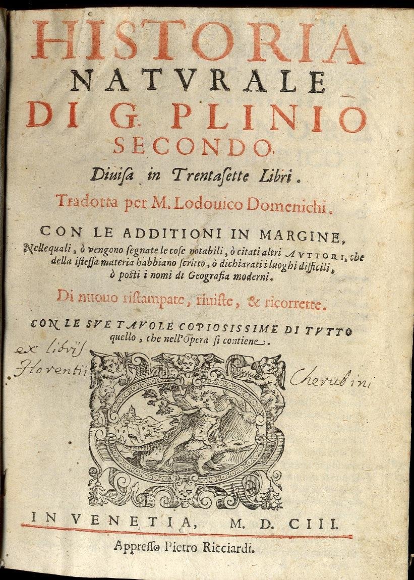Historia Naturale...tradotta per M. Lodovico Domenichi, con le additioni in margine, nelle quali, o vengono segnate le cose notabili, o citati altri Autori, che della istesa materia habbiano scritto, o dichiarati i luoghi difficili, o posti i nomi di Geografia moderna... Con le tavole copiosissime di tutto quello che nell'Opra si contiene.