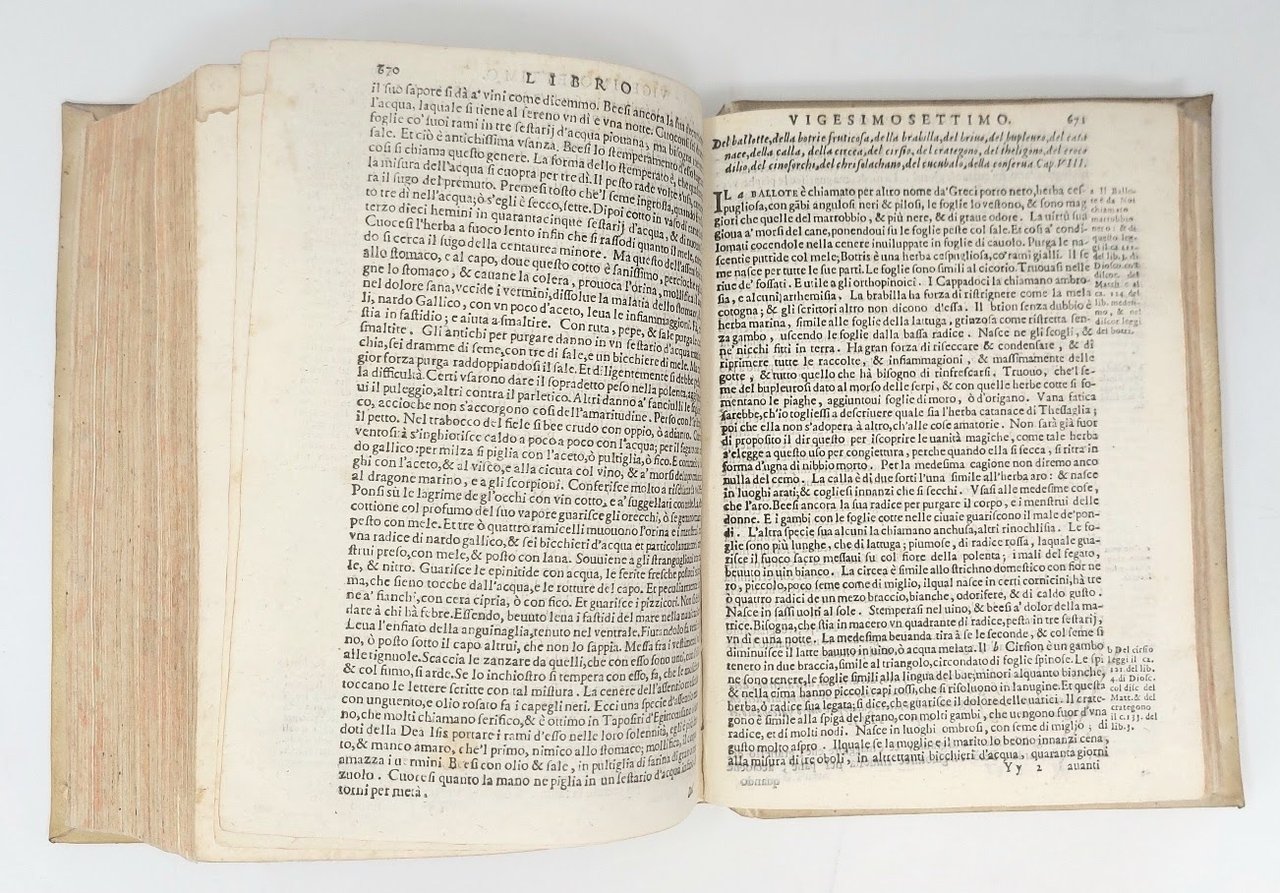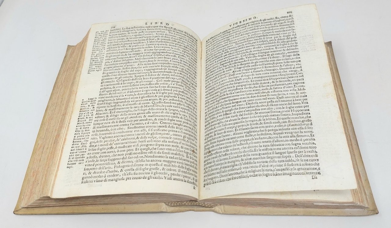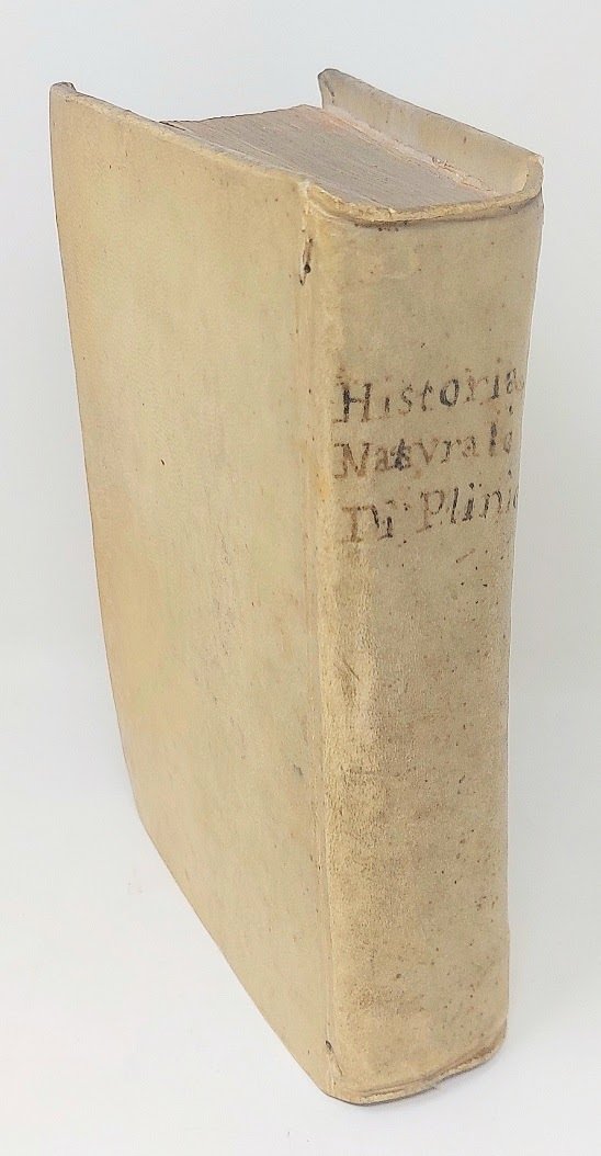 >in-4. pp. 14, (2 bianche), 15-50, (2 bianche), 930, (i.e. 966, numerosi errori nella paginazione), manca ultimo f. bianco. Legatura coeva in pergamena rigida, titolo manoscritto al dorso, tagli spruzzati. Titolo in rosso e nero, impresa dello stampatore. Importante traduzione italiana del Domenichi della enciclopedica Storia Naturale di Plinio (Como 23 d.C. - 79 d.C.), la quale contiene molti riferimenti interessarti e chiari sulla gastronomia medioevale. L'opera di Plinio il Vecchio ebbe a partire dal 1469 gran numero di edizioni in lingua latina e in traduzioni italiane e un altre lingue. Buon esemplare, antica nota di possesso al titolo ''Florentii Cherubini'' e alcune postille n.t. e sulle sguardie trascritto una sorta di indice. Bagnasco. Opere di Gastronomia, vol.II, pp-1328 e seguenti.