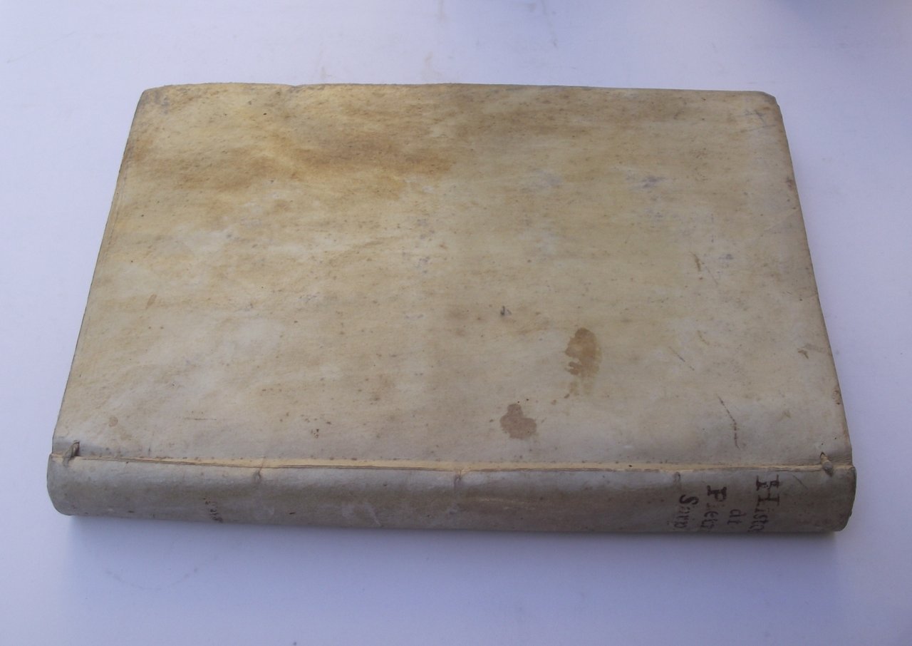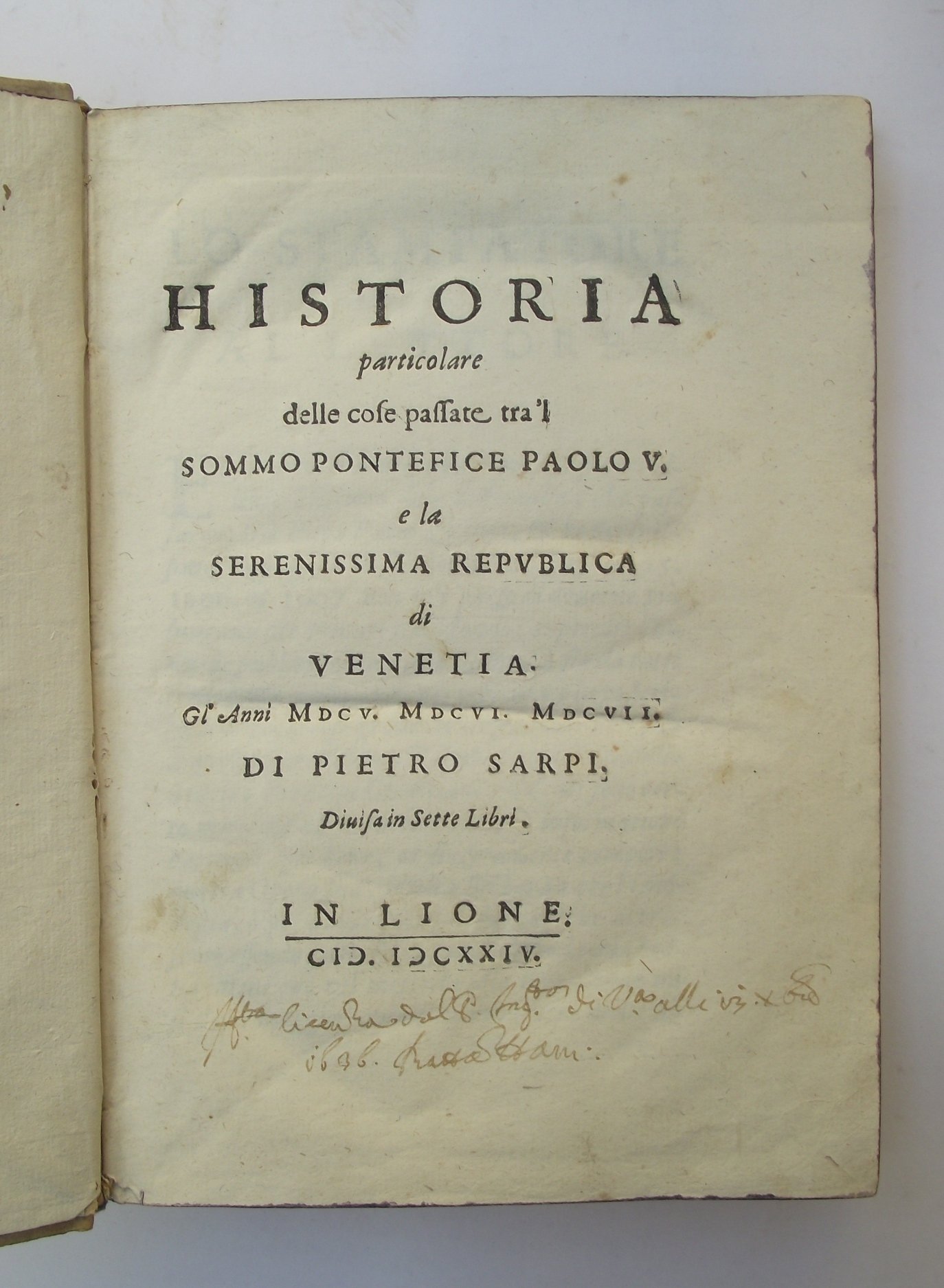 Cm. 22, pp. (4) 328. Legatura coeva in piena pergamena semirigida con nervi a vista e titoli manoscritti al dorso. Esemplare marginoso, genuino ed in eccellente stato di conservazione. Si tratta verosimilmente della prima edizione di quest'opera che nello stesso anno vide apparire un'altra impressione con luogo di stampa Mirandola. Verte sulla presa di posizione della Repubblica di Venezia in difesa della libertà del potere civile contro le usurpazioni del potere ecclesiastico che ledevano la libertà dello stato. Il processo di irrigidimento dottrinale e l'accentramento burocratico della Chiese controriformista nel periodo successivo al Concilio di Trento (1545-63) avevano spinto il Papa Paolo V a scagliare nel 1606 l'interdetto contro la Repubblica di Venezia che rifiutava di rimettere al foro ecclesiastico questioni che riteneva di competenza del Consilio del Dieci. Nel conflitto sorto tra la Repubblica veneziana e Paolo V, Sarpi fu appassionato difensore dell'autonomia giurisdizionale dello Stato. Eletto infatti consultore "in iure" con la qualifica di teologo canonista impugnò brillantemente la giustificazione dottrinale dell'azione del Papa divenendo vero campione dello Stato nei rapporti con la Chiesa. Cfr. Cicogna, Graesse e Piantanida.