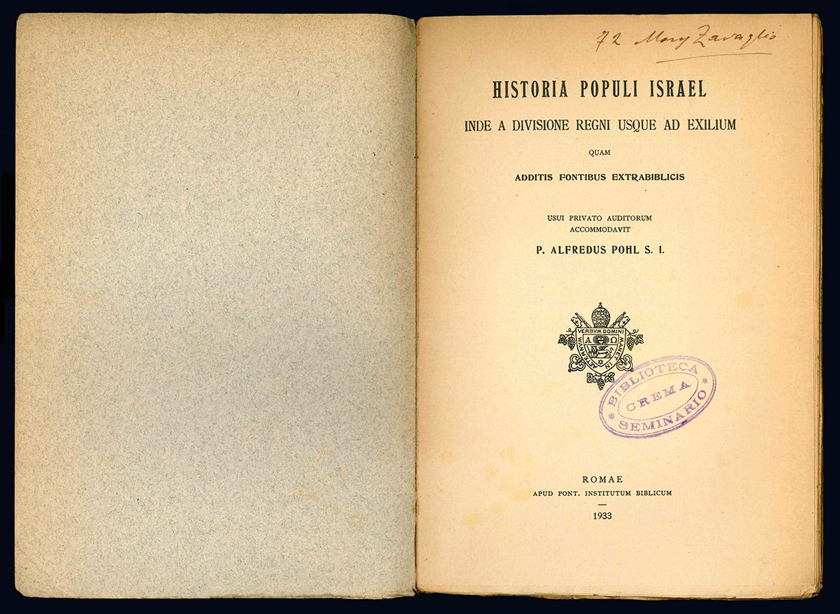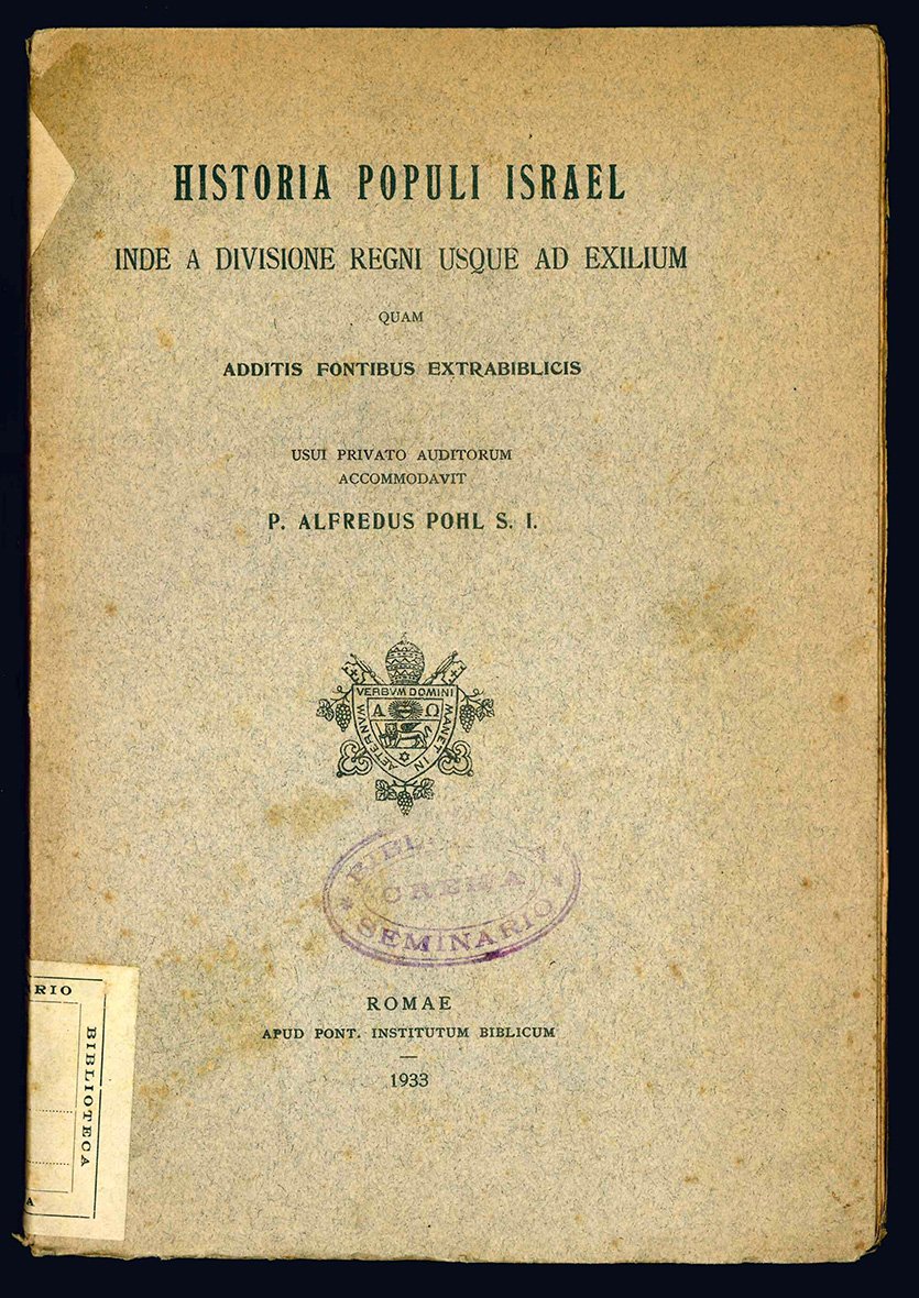 In 8vo (mm 232x160); pp. XI, [1], 194, [2], 42*, [2]. Al termine del volume si trovano "Textus extrabiblici quibus historia populi Israel a regni divisione usque ad exilium Babylonicum illustratur". Carta leggermente ed uniformemente brunita. Brossura editoriale. Lievi aloni alle copertine, tesselli cartacei riportanti la collocazione del volume applicati ai margini superiore ed inferiore del dorso. Timbro della Biblioteca del Seminario di Crema alla copertina anteriore e al frontespizio. Un po' sciolto.