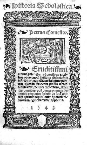 In-16 gr. (mm. 180x118), mz. pelle ottocentesca (risg. rifatti), dorso a cordoni con decoraz. e titolo oro, 255 cc.num., 1 c.b., frontespizio inquadrato da ricchi fregi con titolo in rosso e nero e bella vignetta; testo su due colonne a caratteri gotici, ornato da graziosi capilettera, tutto inc. su legno. Fondamentale commentario che mantiene essenzialmente l'impronta delle edizioni parigine del 1513.Cfr. Adams,II, p. 69.Pietro Comestore (n. forse Troyes - m. Parigi 1179), teologo; maestro quindi canonico regolare a S. Vittore a Parigi, è noto soprattutto per la sua "Historia scholastica", ove tenta una grande storia sacra' dalle origini del mondo al viaggio di Paolo a Roma: segue nello svolgimento del suo piano la Bibbia e i Padri, riferendo però sempre cronologicamente gli avvenimenti religiosi agli eventi della storia dei popoli antichi; l'opera gli meritò il titolo di "magister historiarum". Così Diz. Treccani, IX, p. 404.Lieve uniforme arross. diffusa ma buon esemplare.