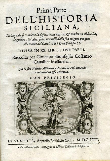 Historia Siciliana. Nella quale si contiene la descrizione antica, et moderna di Sicilia, le guerre, et altri fatti notabili dalla sua origine persino alla morte del Catolico Re Don Filippo II. Divisa in XX Lib. et due Parti. Raccolta per Gioseppe Buonfiglio Costanzo Cavallier Messinese.