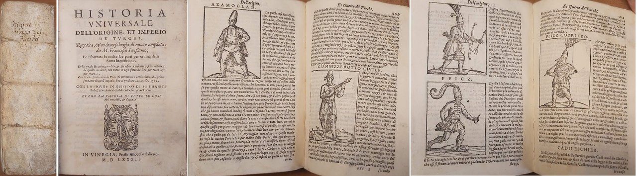 HISTORIA UNIVERSALE dell'origine et imperio de' Turchi. Raccolta & in diversi luoghi di nuovo ampliata da… Et riformata in molte sue parti per ordine della Santa Inquisitione. Nella quale si contengono le leggi, gli offici, i costumi & la militia di quella natione, con tutte le cose fatte da loro per terra & per mare. Con le vite particolari de Principi Othomani, cominciando dal primo fondator di quell'Imperio, sino al presente Amorath 1582. Con le figure in disegno de gli habiti, & dell'armature de soldati d'esso gran Turco.