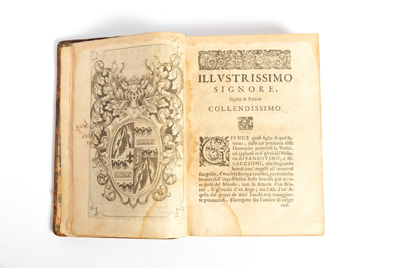 In-4°, mm 230x160, pp. (32), 471, (2). Grande stemma araldico del dedicatario inciso al verso del frontespizio e vignetta raffigurante Minerva con elmo appoggiata a un albero al recto, fregi e capilettera nel testo. Legatura coeva in piena pelle, dorso decorato in oro con titolo in oro su tassello. Qualche segno d'uso ai piatti, fenditura alla cerniera ma volume solido, tagli rossi. Le prime carte con uniforme brunitura, peraltro ben conservato e marginoso esemplare. La seconda parte da considerarsi opera a sé stante contenente le vite degli imperatori Ottomani qui, come spesso, assente. Prima edizione con le aggiunte di Maiolino Bisaccioni (Ferrara 1582 - Venezia 1663). Pubblicata in origine nel 1560 e redatta dal Sansovino direttamente dalle importanti fonti diplomatiche che gli venivano dagli archivi veneziani.. *** TUTTI I NOSTRI LIBRI SONO VISIBILI PREVIO CONTATTO MAIL O TELEFONO NELLA NUOVA SEDE DI MILANO: LIBRERIA COSMOPOLIS, VIA JOMMELLI, 22. ***