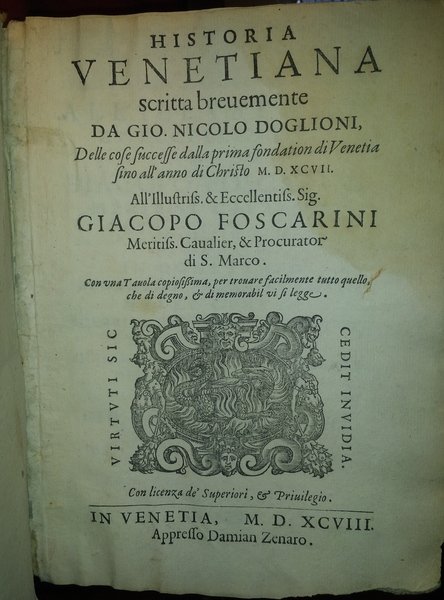 Historia venetiana scritta brevemente da Gio. Nicolo Doglioni, delle cose successe dalla prima fondation di Venetia sino all'anno di Christo MDXCVII. All'illustriss. & Eccellentiss. Sig. Giacopo Foscarini Meritiss.Cavalier, & Procurator di S. Marco. Con una tavola copiosissima, per trovare facilmente tutto quello, che di degno, & di memorabil vi si legge.