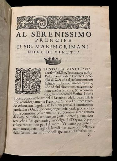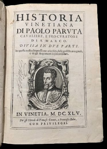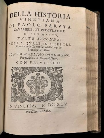 In 4° (24,5x17,5 cm); due parti in un volume: (4), 596, (32) pp. e 320, (16) pp. Uno strappetto a pagina 23, senza perdita di carta, dovuto forse ad un difetto della stessa prima della stampa ed ininfluente e all'interno in ottime condizioni di conservazione. Antica nota di possesso seicentesca al frontespizio del primo volume G. Berinet (?). Legatura coeva in piena pelle con titolo e ricchi fregi in oro ai tasselli. Dorso a 5 nervi. Qualche strofinatura e lievi difetti alle cerniere ed ai margini del dorso con perdita di piccole porzioni di pelle ma legatura solida e genuina. Tagli leggermente spruzzati in rosso. Seconda edizione, preferita alla prima in quanto presenta numerose aggiunte, di questa celebre opera del grande politico, storico e diplomatico veneziano Paolo Paruta (Venezia, 14 maggio 1540 - Venezia, 6 dicembre 1598). L'opera qui presentata, apparsa postuma, venne scritta da Paruta come naturale proseguimento delle "Rerum Venetarum Historia" del Bembo. Divisa in 12 libri tratta della storia veneziana negli ani cruciali della sua storia che vanno dal 1513 al 1572. La seconda parte dell'opera contiene così la cronaca della celebre guerra di Cipro che vide contrapposti Venezia ed i Turchi che riuscirono alla fine a conquistare l'isola. Paruta "Nato a Venezia da una famiglia di antica origine lucchese (i Paruta), dopo aver studiato a Padova, ha avuto numerosi ruoli politici all'interno della Repubblica di Venezia tra cui quello di segretario ad uno dei delegati veneziani al Consiglio dei Dieci. Nel 1562 accompagnò l'ambasciatore Michele Suriano alla corte dell'imperatore Massimiliano II agendo come storiografo ufficiale della Repubblica, durante questa sua funzione scrisse l'orazione funebre per i morti nella battaglia navale di Lepanto. Dopo il cambio di governo fu eletto Savio della Terraferma (responsabile dell'amministrazione dei possedimenti continentali della Repubblica) e quindi senatore. Nel 1579 fu nominato storico ufficiale della Repubblica in successione a Luigi Contarini. Continuò la narrazione da dove il Cardinale Bembo la aveva lasciato nel 1513, completandola fino al 1551. Fu eletto provveditore della Camera nel 1580, commissario del Cadore nel 1589, Savio del gran consiglio nel 1590, governatore di Brescia dal 1590 al 1592, ambasciatore presso il Papa a Roma dal 1592 al 1595, quindi provveditore (procuratore) di San Marco nel 1596 a pari dignità del Doge e provveditore delle Fortezze nel 1597. L'anno successivo morì.". Scrive il Lozzi riguardo al lavoro di Paruta: "Non ha pari il Paruta, a giudizio del Foscarini, nelle storie antiche italiane, singolarmente per gli ammaestramenti civili instillati con mirabile accortezza nell'intero corpo della narrazione e provenienti da ricco fondo di dottrina in quella parte che riguarda i costumi degli uomini e dei governi". Lozzi, 6088. Cfr.: ICCU IT\ICCU\IEIE\002748;IT\ICCU\IEIE\002748; Gamba 1328; Atabey, 928; Cicogna, Bibl. Veneziana, 571; Cobham-Jeffery, p. 49; Lozzi, 6088; Platneriana, 420; Graesse, V, 144.