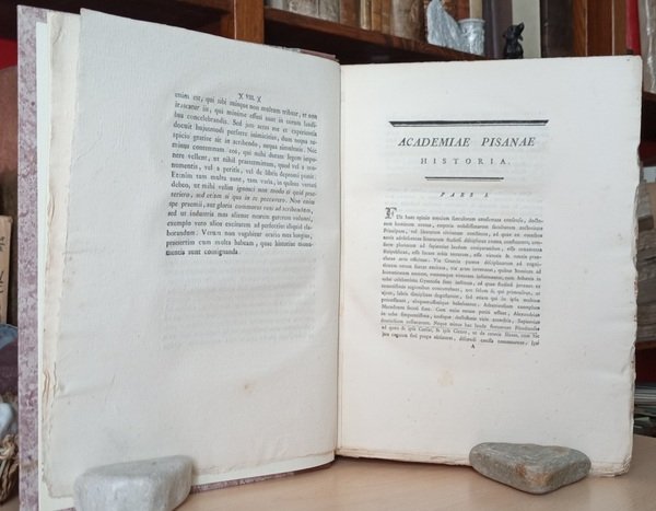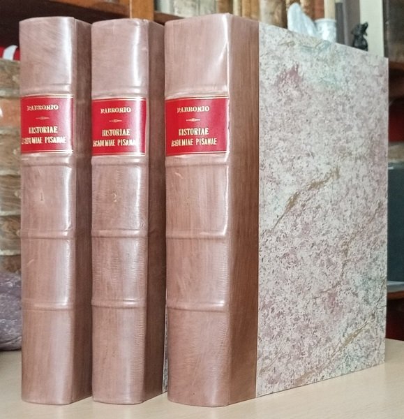 Tre volumi in 4 grande legati in mezza pelle, titolo ai tasselli ai dorsi a nervi, sguardie, frontespizi, VIII, 493, 496, 699 pp., carte d'errata. La storia e l'evolversi dell'Accademia Pisana in una splendida e commendevole opera, completa ed esaustiva. In eccezionale stato di conservazione, in barbe, carta bianca, nerbata e greve, pieni margini, esente da difetti: Rara a reperirsi soprattutto in queste condizioni. Davvero notevole