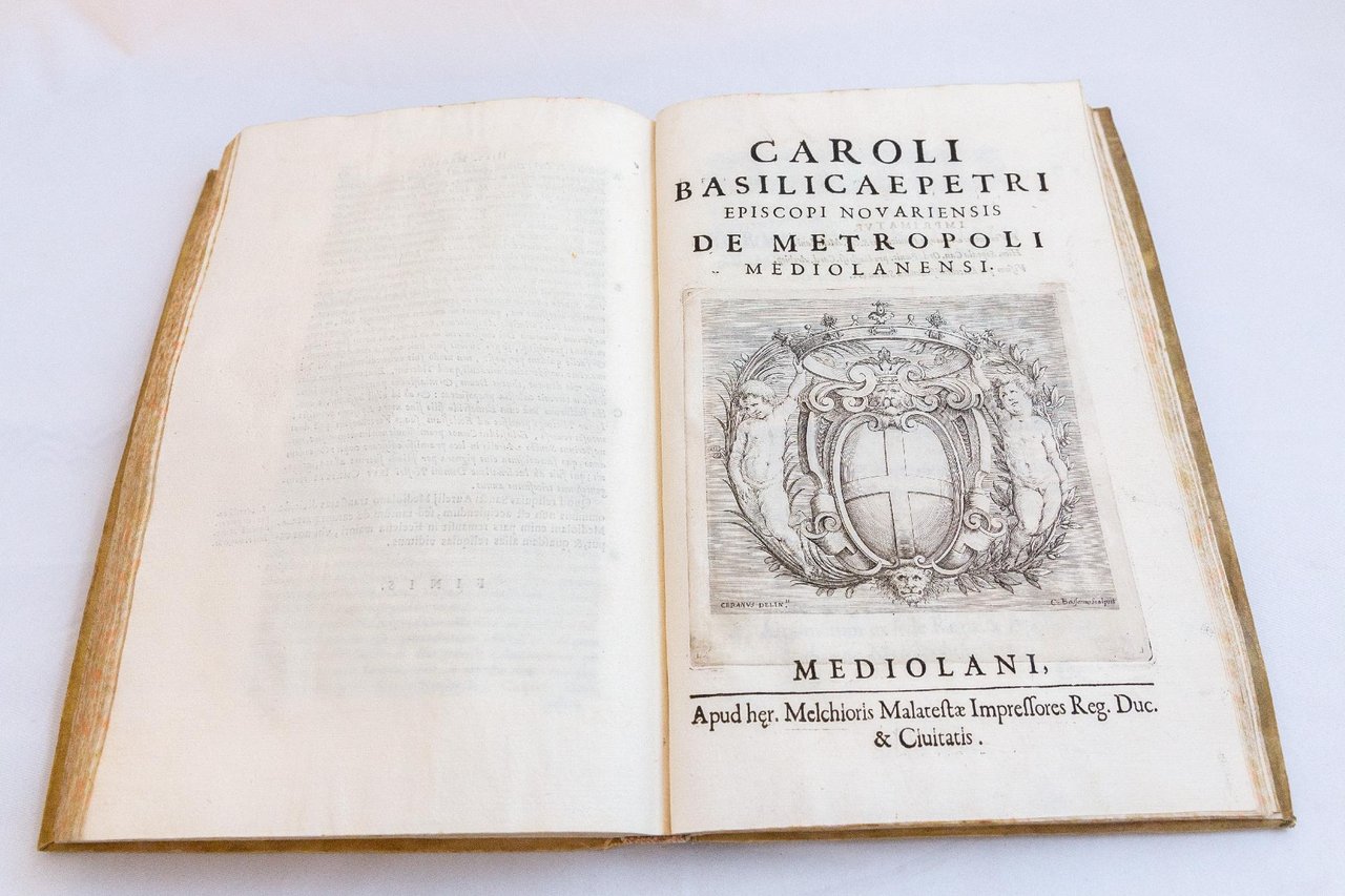 5 opere in un volume in folio di illustre provenienza (ex libris Leo Olschki al contropiatto). Legatura in piena pergamena coeva. Prima opera: pp. (4), 81, con ritratto dell'autore a piena pagina, grande stemma inciso al frontespizio. L'opera è divisa in due parti, la seconda è il De Bello Mussiano Liber che narra le gesta di Giangiacomo De Medici (detto il Medeghino, celebre uomo d'armi lombardo, 1498-1555) sul lago di Como e della guerra di Musso. Bell'edizione in formato maggiore rispetto all'originale. Il nostro esemplare contiene anche le QUATTRO opere del vescovo di Novara Carlo Bascapé inerenti la storia di Milano. Grande stemma di Milano inciso dal Bassano da disegno del Cerano stampato sul frontespizio di ciascuna opera. – De Deis. Successores S. Barnabae Apostoli in Ecclesia Mediolanensi ex biblioth. Vaticanae manuscr. olim cardinalis Syrleti a Ioanne De Deis primum, mox a P.D. Eugenio Cattaneo cler. reg. congr. S. Pauli, & episcopo Telesino editi. Milano, Malatesta, 1628 UNITO A: Caroli Basilicae Petri episcopi Nouariensis Breuis historia prouinciae Mediolanensis ab initio ad Christum natum et 11. priorum archiepiscoporum Mediol. Vitae. UNITO A: Caroli Basilica Petri episcopi Novariensis De metropoli Mediolanensi UNITO A: Caroli Basilcaepetri episcopi Nouariensis Fragmenta historiae Mediolanensis. . *** TUTTI I NOSTRI LIBRI SONO VISIBILI PREVIO CONTATTO MAIL O TELEFONO NELLA NUOVA SEDE DI MILANO: LIBRERIA COSMOPOLIS, VIA JOMMELLI, 22. ***