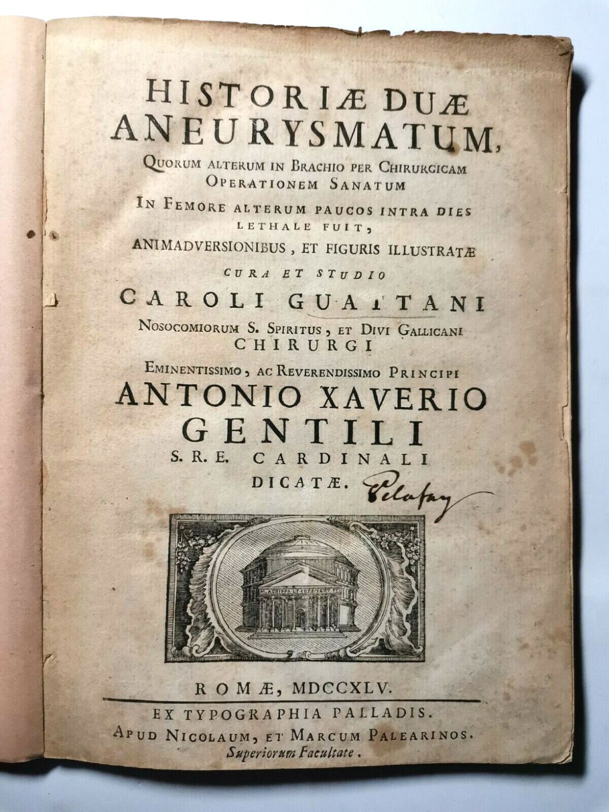 HISTORAE DUAE ANEURYSMATUM, QUORUM ALTERUM BRACHIO PER CHIRURGICAM OPERATIONEM SANATUM IN FEMORE ALTERUM PAUCOS INTRA DIES LETHALE FUIT, ANIMADUERSIONIBUS, ET FIGURIS ILLUSTRAE CURA ET STUDIO CAROLI GUATTANI NOSOCOMIORUM S. SPIRITUS ET DIVI GALLICANI CHIRURGI. EMINENTISSIMO, AC REVERENDISSIMO PRINCIPI ANTONIO XAVERIO GENTILI S. R. E. CARDINALI DICATAE. Roma,ex typographia Palladis apud Nicolaum et Marcum Palearinos, 1745,
