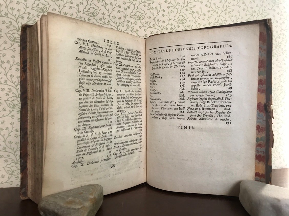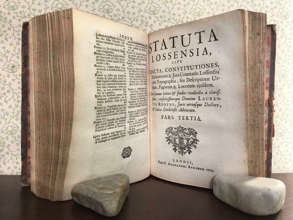 Volume in 4 piccolo, legatura coeva in piena pelle (mende), titolo inciso al dorso a 4 nervi, ornato da impressione a secco, sguardie pavonate, frontespizio stampato a due colori, 3 cc., 306 pp., 6 carte d'indici, frontespizio dei Diplomata, 48 pp., una carta d'indici, frontespizio degli Statuta, 172 pp, due carte d'indici. Opera di studio ed approfondimento dell'enclave belga di cui si scorrono le vicende e si evidenziano gli accadimenti importanti. Particolarmente notevole l'edizione degli statuti, con traduzione latina a fronte. Stampato su bella carta forte, ancor chiara e frusciante. Notevolmente poco comune, per lo pi assente dal mercato di vendita, soprattutto completo, originale in ogni sua parte, ed in cos belle condizioni (fatto salve le mende alla legatura, davvero ininfluenti e facilmente restaurabili). Bello, importante e raro.