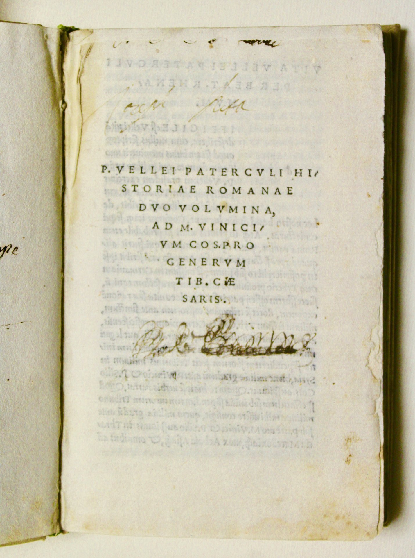 In 8° (mm 155x100); carte. (8), 205-267, (1). Marca editoriale al verso dell'ultima carta. Piena pergamena secentesca, dorso a cinque nervi recante autore manoscritto. <BR>Prima edizione stampata in Italia delle Historie di Velleio Patercolo, storico romano del I secolo d. C. Si tratta del secondo volume dell'opera "Epitome Historiarum Trogi Pompeii" di Giustino che, nel primo volume (qui assente), comprende oltre all'opera citata nel titolo, le "Vitae imperatorum externorum" di Emilio Probo. E'una dei più importanti documenti storici sull'età di Augusto e Tiberio, Beato Renano scoprì il manoscritto nel monastero alsaziano di Murbach nel 1515 e pubblicò l'opera in collaborazione con Froben nel 1520. <BR>Buon esemplare, ricco di note manoscritte antiche nella prima parte. Nota di possesso alla sguardia superiore, altra nota di possesso cassata a penna; rifilatura al margine superiore della prima carta per eliminare un'ulteriore firma. Fioriture, qualche alone di umidità. Non comune cinquecentina fiorentina.<BR>Adams p.414.<BR>
