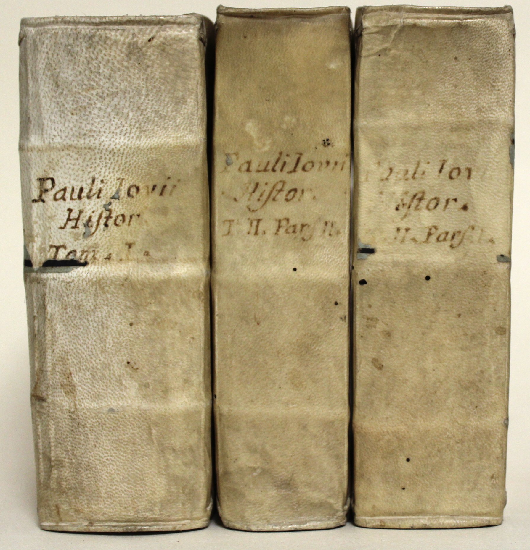 Voll. 2 in tre tomi in 16° (155x105); cc. (8) 415; cc. 40, pagg. 81-680, (16); 618, (30).<BR>Al frontespizio ritratto silografico di Giovio, inciso entro ovale. Capilettera istoriati entro vignette silografiche, di cui una con veduta di città. Pergamena seicentesca con titolo manoscritto al dorso.<BR>La prima edizione dell'opera fu stampata a Firenze nel 1550-1552 presso Lorenzo Torrentino. Divisa in 45 libri l'Historiarum sui temporis abbraccia l'arco temporale fra l'invasione d'Italia ad opera di Carlo VIII e il 1547.<BR>Ottimo esemplare anche se presenta margini un po' brevi, leggerissima traccia di tarlo sulla coperta di tutti i volumi e sulla sguardia del secondo. Piccoli fori ai frontespizi; lieve alone al tomo I; alcune pagg. con leggeri arrossamenti al tomo II. <BR>