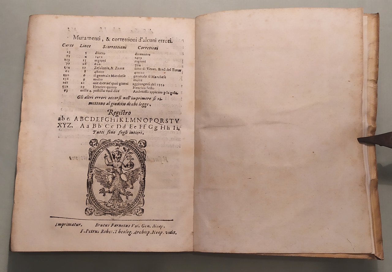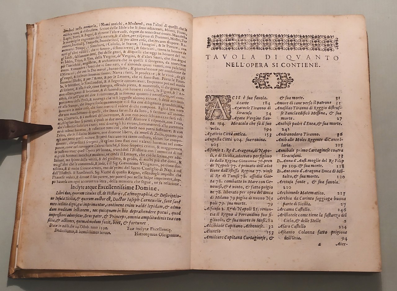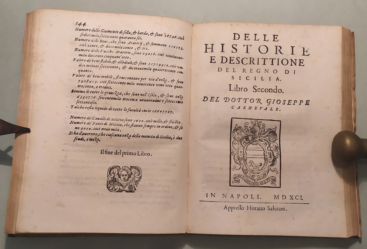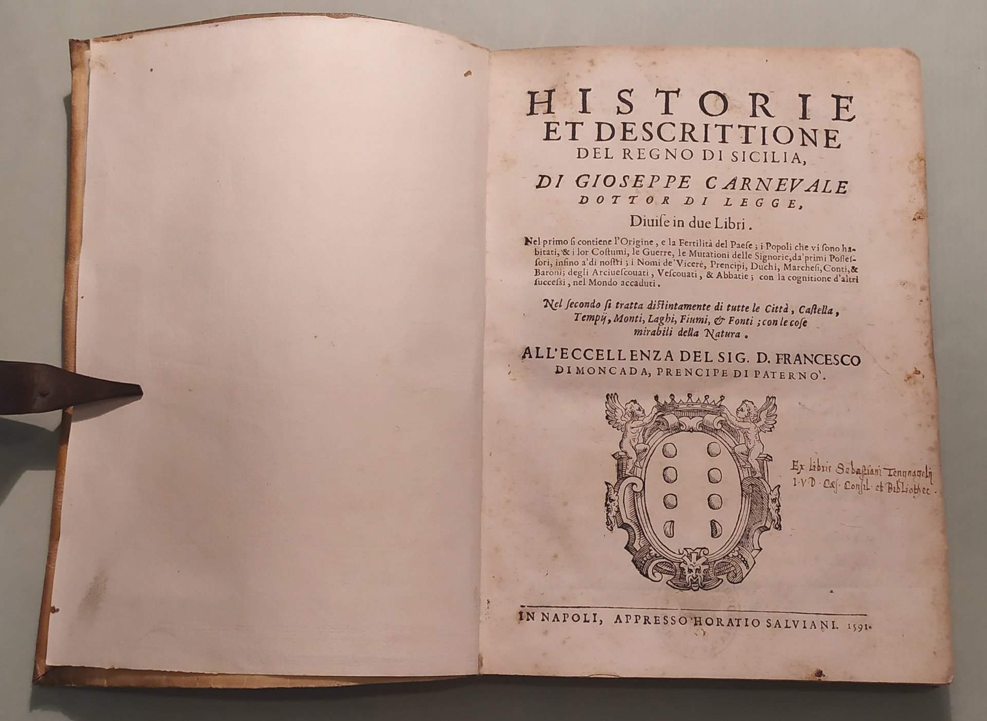 Nel primo si contiene l’origine, e la fertilità del paese, i popoli che vi sono habitati e i lor costumi, le guerre, le mutationi delle signorie, da’ primi possessori à di nostri; i nomi dè Vicerè, Prencipi, Duchi, Marchesi, Conti e Baroni; degli arcivescovati, vescovati e abbatie con la cognitione d’altri successi nel Mondo accaduti. Nel secondo si tratta distintamente di tutte le città, castella, tempij, monti, laghi, fiumi e fonti con le cose mirabili della natura. Napoli, Orazio Salviani, 1591. In 8vo; cc.10n.nn; pp.253. Stemma al primo frontespizio del Principe di Paternò a cui l'opera è dedicata. Stemma dell'autore al frontespizio del secondo libro. In fine vignetta incisa raffigurante il Bambino Gesù che cavalca un'aquila. Pergamena coeva. Timbro d'appartenenza. Edizione originale. Lozzi, 5017; Manzi, Annali di Orazio Salviani, 157; Mira I, pag.181: "Raro"; Moncada, 493: "Rara ed interessante opera in due libri. Alla fine della prima parte l'elenco dei Vicerè; seguono gli elenchi degli Arcivescovi ed Abati con le loro rendite; i nomi dei componenti il Braccio Militare. Viene poi fornito il numero di cavalli in Sicilia, di fanti, di buoi, del valore di beni stabili ed allodiali ecc. La seconda parte è invece dedicata ad una descrizione, per il vero pochissimo conosciuta, dell'Isola".