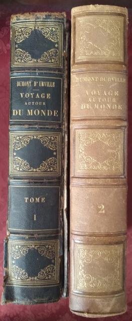 Opera completa in due volumi. Volume I: Furne et. C.e Édieturs, Paris, 1859. In 4to, pp. XI, 550 + 1 (Table des Chapitres), incisioni su acciaio in b/n f. t. protette da velina, leg. orig. in t. percallina marrone con titoli e fregi oro al dorso, tagli oro. Ripristinato il piatto anteriore al dorso (non ben giuntato), segni marginali ma marcati di umido al contropiatto, foxing e fioriture più diffuse alle prime pagine e comunque presenti, seppur in maniera marginale, in tutto il volume, un progressivo alone di umido al margine inferiore interessa le pagine e quindi talora anche le tavole, staccata una tavola dai margini non belli. Nell'insieme esemplare con difetti ma completo delle tavole, in cui tutte risultano discrete seppure interessate da marginali fioriture, tipiche in volumi con questo tipo di carta. Volume II: Furne et. C.e Édieturs, Paris, 1843. In 4to, pp. 584 (con la Table des Chapitres, Table Analytique e Table des Planches), incisioni su acciaio in b/n f. t. protette da velina + alcune carte ripiegate, leg. orig. con piatti in cartonato, dorso in pelle con fregi e titoli oro, punte, contropiatti e fogli di guardia rivestiti in carta marmorizzata. Le carte risultano in parte interessate da ingiallimento, normale foxing e fioriture alle pagine, tipiche in volumi con questo tipo di carta, ma nell'insieme trattasi di un solido e buon esemplare, in cui anche tutte le tavole risultano buone. L'opera tratta di viaggi, esplorazioni e scoperte marittime compiuti dai più famosi navigatori, descrive approfonditamente razze, società, usi, costumi e tradizioni dei popoli, flora, fauna, bellezze e particolarità naturali dei luoghi. Nel primo volume: Gibilterra, Brasile, Capo di Buona Speranza, Madagascar, India, Filippine, Cina, Giappone Isole Hawaii. Nel secondo volume: le isole dell'Oceania, Africa, America, Europa. I due volumi, peggiore il primo, migliore il secondo, appartengono a edizioni diverse ma completano l'opera. .