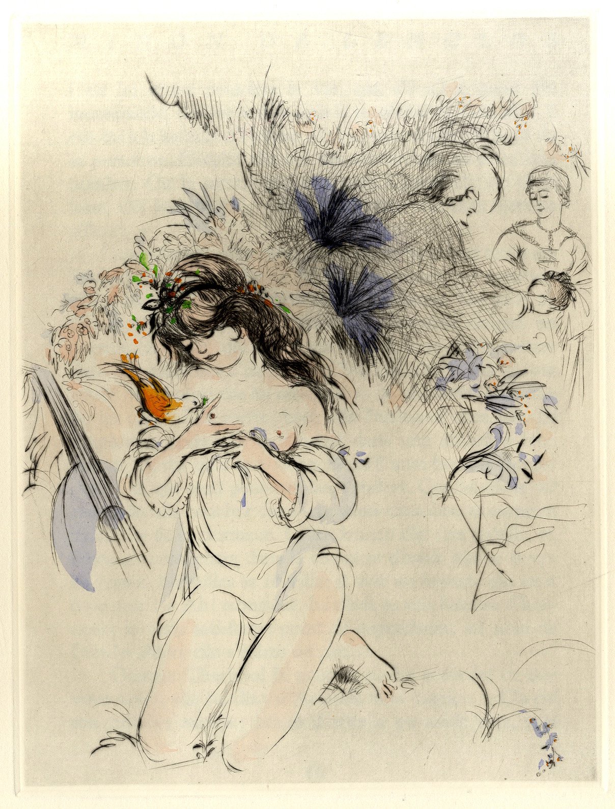 >in-folio, pp.177, (6), impresse su ''grand vélin de Mandeure'' in 350 copie numerate (147 il presente esemplare), riservate ai Bibliophiles de la Basoche. Illustrate da 14 tavole a piena pagina fjuori testo, punte-secche disegnate e incise da Amandine Doré, di chiari soggetti galanti e scene erotiche assai naturali. Incisioni tirate nell'atelier di Manuel Robbe. Accuratamente impresso. Esemplare perfetto sotto copertina editoriale, a quaderni sciolti, in custodia originale di cartoncino figurato e decorato. Figurato d'artista del novecento non comune, in origine pubblicato e riservato per un'associazione di bibliofili privati.