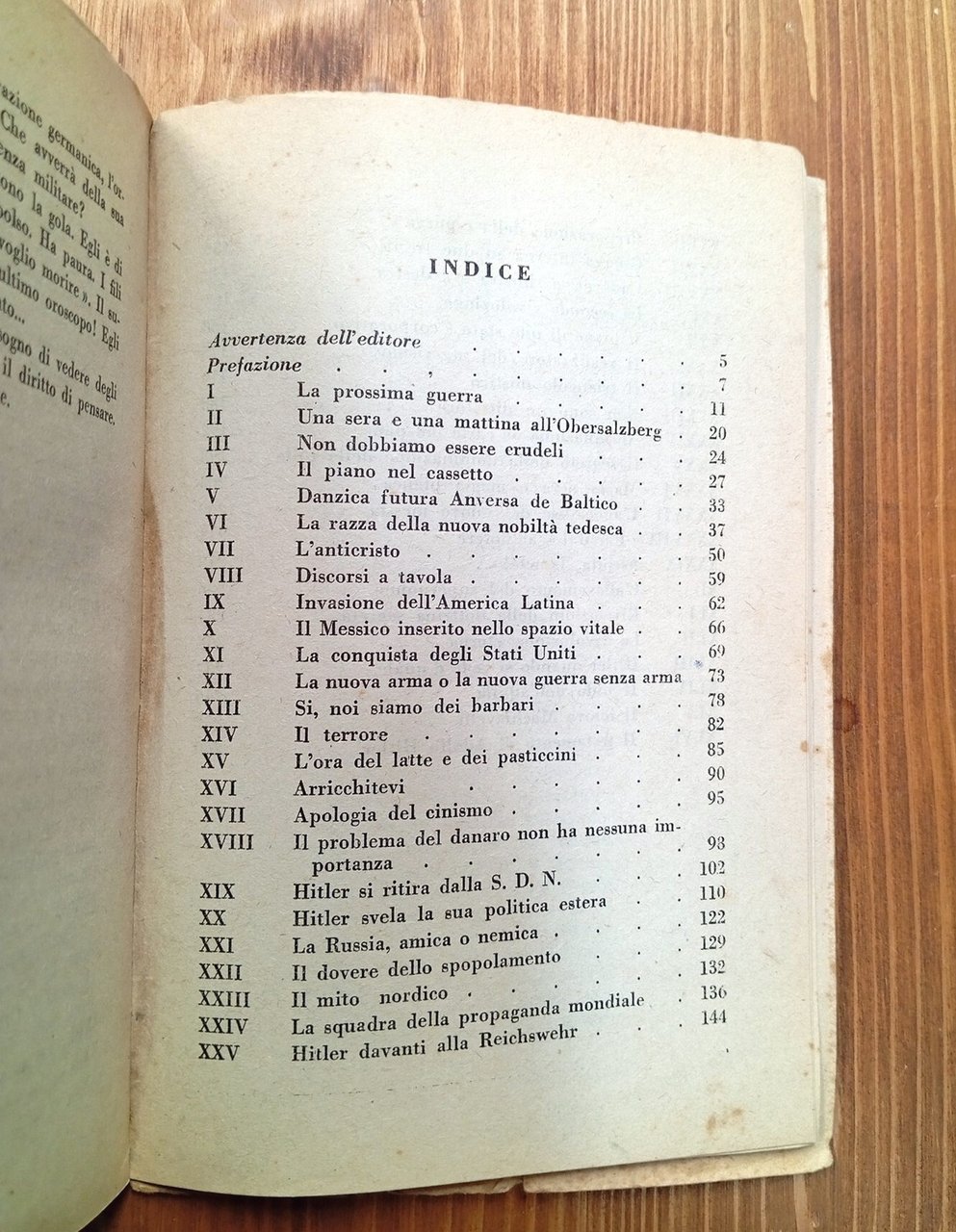 Prima edizione italiana; stampa a cura di Tumminelli. Collana "Rivelazioni", 1 - Brossura originale di 270 pagine. Indice integrale consultabile nelle nostre immagini. Inevitabili segni d'uso e del tempo, occasionali segnetti a matita in margine al testo, peraltro esemplare in buono stato di un'edizione rara -- Pubblicata durante l'occupazione tedesca, per questa edizione la casa editrice scelse quel nome perché, sotto la minaccia della fucilazione per i colpevoli di stampa clandestina, i promotori, i traduttori, i tipografi, lavorarono nel pericolo e nel mistero. Raccoglie le memorie dell'ex-primo ministro nazional-socialista dello Stato libero di Danzica, entusiasta esponente di spicco del partito hitleriano che si fa via via più scettico.