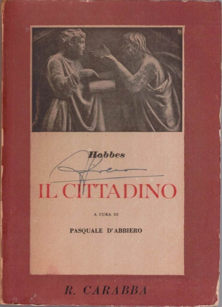 Tommaso (Thomas) Hobbes, Il cittadino, a cura di Pasquale D’Abbiero, Casa Editrice R. Carabba S/A, Lanciano-Roma 1948, pp. 239, cm 19, br. ed. Collana Classici del pensiero e dell’educazione, vol. 20. Indice: Prefazione di Pasquale D’Abbiero – Dedicatoria – Ai lettori – Il cittadino (Parte prima: La libertà – Parte seconda: Lo Stato – Parte terza: La religione). Firma d’appartenenza alla prima di copertina. Leggere tracce d’uso, lieve brunitura della carta, per il resto ben conservato.