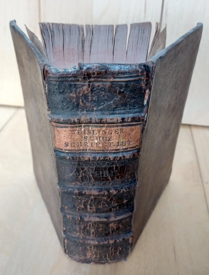 - Einband berieben, oberes Kapital etwas abgegriffen, Scharniere außen angeplatzt und privat nachgeklebt, innen teils braunfleckig.
