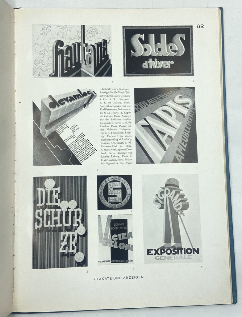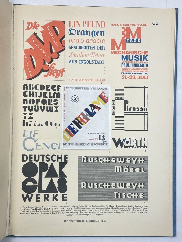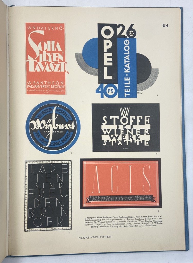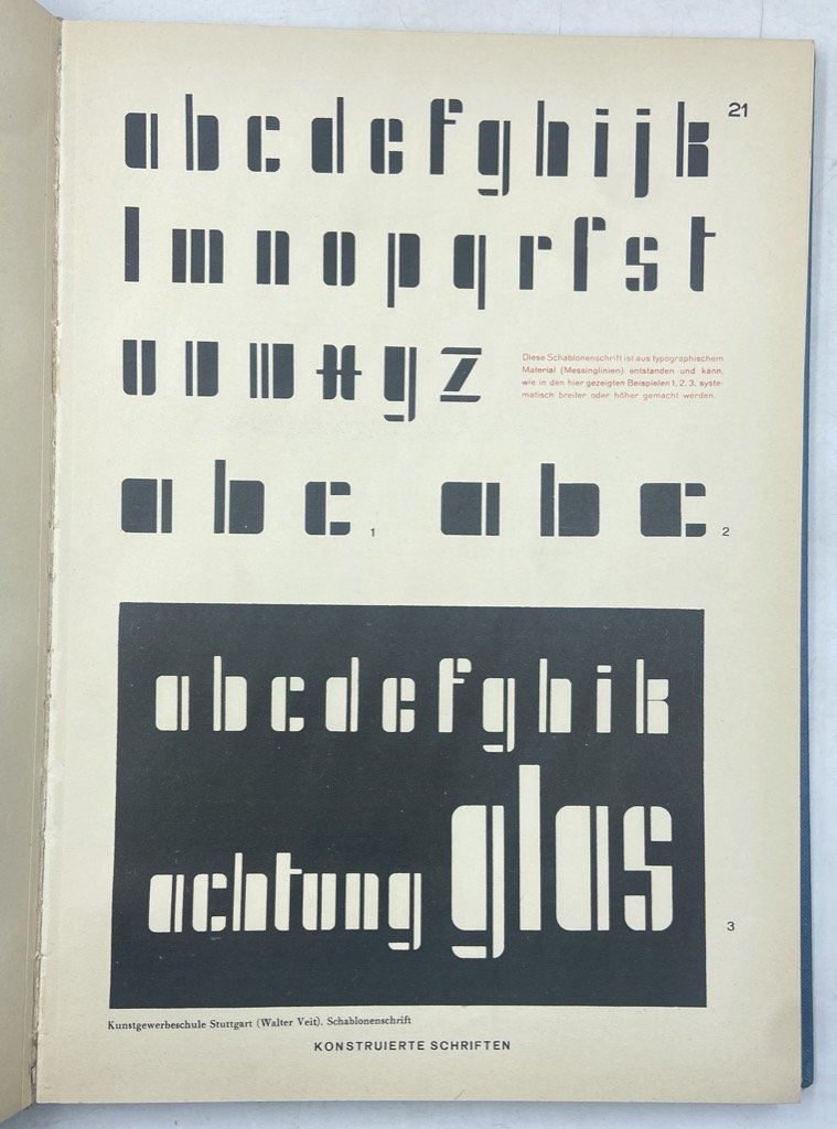 Legatura editoriale in tela azzurra con titoli argento, custodia parlante in cartoncino, cm 35 x 28, PP VIII di testo (in tedesco) e 80 tavole stampate al solo recto in bi- e tri-cromia, alcune su carta patinata e con illustrazioni a colori applicate. Lievi segni d'uso sulla custodia ma bell'esemplare. Prima edizione di questo interessante repertorio tipografico curato da Herbert Hoffmann con Albert Bruckner, Max Hertwig e Rudolf Koch, poi ristampato, con qualche aggiunta, nel 1952; il volume raccoglie molti specimen di alfabeti, monogrammi, iniziali e loghi, presentando accanto a caratteri più antichi molti esempi che riflettono le ricerche dell'epoca, Bauhaus in testa. Tra gli specimen troviamo lavori di Rudlof Koch, Margarete Leins, Anna Simons, Friedrich Heinrichsen, Walter Veit, Walter Cyliax, Arthur Schulze, Heinrich Jost, Walter Tiemann, Paul Renner accanto a classici come Bodoni, Casion, Garamond, Unger.