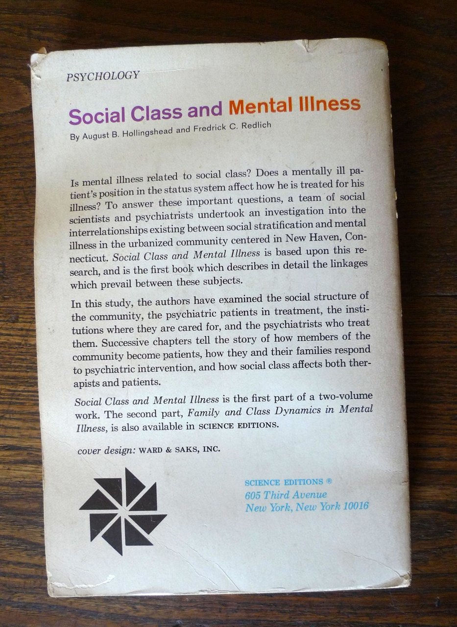 SOCIAL CLASS & MENTAL ILLNESS.A Community Study byAugust B. Hollingshead and Fredrick C. Redlich.John Wiley & Sons, First Science Editions printing, 1964,brossura, 21x14 cm., pp.IX-442,testo in inglese,peso: g.550cod.9524CONDIZIONI DEL LIBRO: accettabili,strappetti ed imperfezioni alla copertina,pagine ingiallite,timbro di biblioteca alla prima pagina
