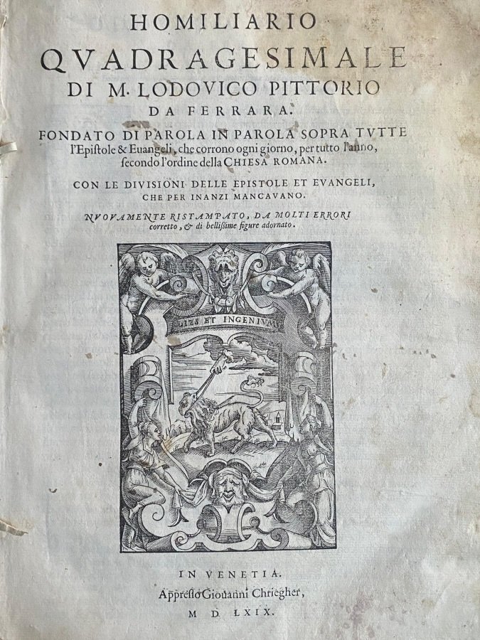 <span style="font-style: normal;">In-folio (cm. 29), genuina legatura coeva in piena pergamena floscia (antiche scritte ai piatti, strappo al dorso e lievi segni d'usura); titolo anticamente manoscritto al taglio inferiore; pp. [8] 360 in buono stato con testo su due colonne, numerose vignette xilografiche e grande marca al frontespizio; antiche note di possesso ai risguardi, alcune macchie alle prime ed ultime carte. L’Omiliario dell'autore ferrarese, stampato per la prima volta a Modena nel 1506 per i tipi di Domenico Rococciola, ebbe in un secolo ben venticinque ristampe. Questa in-folio del Criegher, insieme a quella bresciana del Britannico (1553), si segnala dai bibliografi per la ricchezza iconografica. Cfr. R. Gorris, </span><i>Testo e immagini. Le edizioni cinquecentesche dell’Omiliario quadragesimale di Lodovico Pittorio</i><i style="font-style: normal;">, </i>in <i>Girolamo Savonarola da Ferrara all'Europa</i>, Firenze 2001, pp. 139-154. Buon esemplare. (SH6)