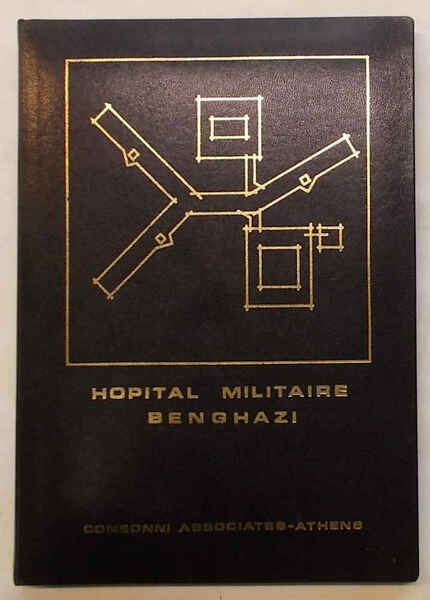 In 4° (cm.35 x 24); pagg. 25 + 4 tavole con vere fotografie a colori applicate e protette da veline e 28 tavole tecniche; similpelle originale con titoli e figura in oro. VG. ** Con invio autografo e biglietto di visita di Attilio Consonni, presidente che ".a élaboré l'étude de ce projet 'General Military Hospital' par ordre du President du conseil de la Revolution Col. M. El Gadafi". Edizione in limitatissimo numero di esemplari, con testo riprodotto da dattiloscritto e vere fotografie dei progetti.