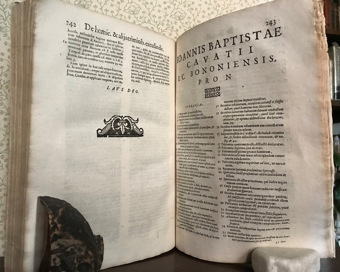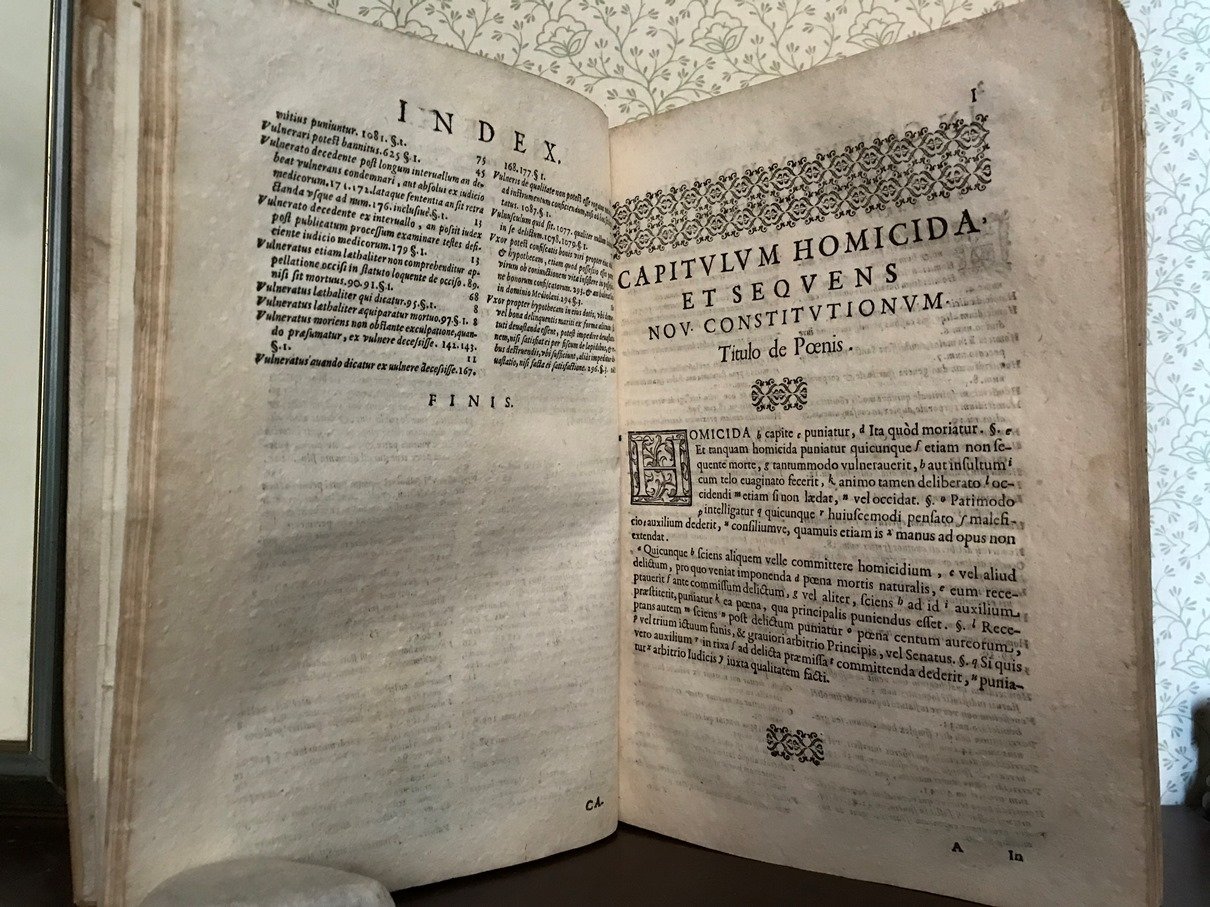 Volume in folio legato in pergamena floscia, titolo calligrafico al dorso, sguardie, frontespizio in due colori con bella, grande marca tipografica, 17 carte di presentazione ed indici, 292 pp. ASSENTI LE PAGINE 287/88 - 289/90. Eccezionale documento sugli Statuti cinquecenteschi di Milano purtroppo mutilo di due carte, una d'indici e l'altra di testo. Parrebbe una svista dell'antico legatore, ma tant': l'opera mutila. Ma di tale importanza e rarit, di cos alto interesse che giocoforza si presenta, tenendo ben conto della mancanza nella valutazione ed essendo essa in pi che bello stato (solo due carte hanno un piccolo difetto al margine bianco esterno). Davvero notevole e rara
