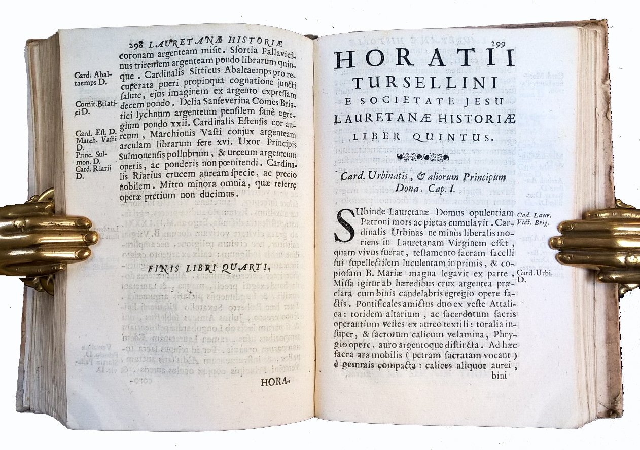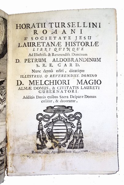 Horatii Tursellini Romani e Societate Iesu Lauretanae historiae libri quinque. Ad illustriss. & Reverendiss. Dominum D. Petrum Aldobrandinum S.R.E. card. nunc […] D. Melchiori Magio […] Laureti Gubernatori. Additis donis quibus Sacra Deiparae Domus colitur, & decoratur. Romae 1597. Apud Aloysium Zannettum. Et nunc Venetiis: sumptibus Andreae Poleti, 1715.