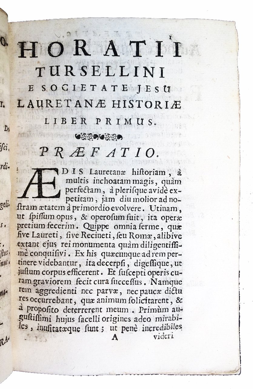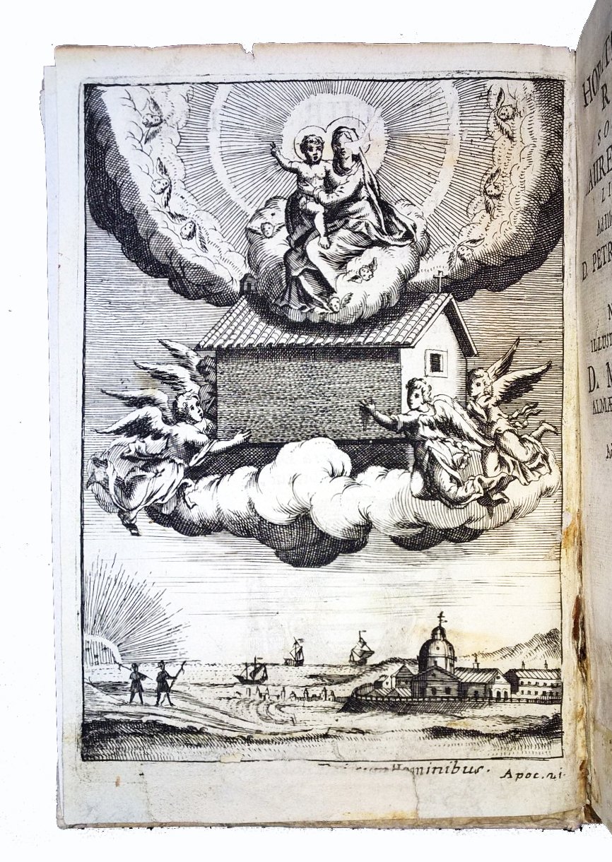 in-8° (164x110 mm), leg. coeva in cartonato grezzo d'attesa, titolo manoscritto al dorso; pp. [20], 460. Mancanti 4 pagine (carte a3 e a4, dopo il frontespizio), nelle quali c'era la dedica al Governatore di Loreto, D. Melchiori Magio, fatta a Loreto il "quarto idibus septemb. 1714"). Antiporta con illustrazione calcografica rappresentante la traslazione della Santa Casa con la Madonna per opera degli angeli. Frontespizio a caratteri neri con stemma cardinalizio xil., che precede l'indicazione di stampa: Romae 1597. Apud Aloysium Zannettum. Et nunc Venetiis: sumptibus Andreae Poleti, 1715 (in questa copia la parte finale di questa indicazione, da "Et nunc ." a ".1715" manca per effetto di un antico restauro alla parte inferiore del frontespizio). Edizione settecentesca che riprende ed amplia la prima edizione del 1597, di questa rara opera, molto interessante per la storia locale di Loreto e per il culto della Madonna di Loreto. Orazio Torsellini (1545-1599), gesuita italiano, storico e letterato. Rif.: IT\ICCU\TO0E\151723 (4 copie). OCLC, 173203570 (1 copia in USA e 1 copia in UK). Cond.: Segni d'uso alla legatura (dorso bruniti, abrasioni e macchie, cerniera anteriore parzialmente rotta). Macchie e gore ad alcune carte (soprattutto al frontespizio ed all'antiporta); tracce di alcuni vecchi restauri. Mancanza di 4 pagine. Nel complesso trattasi di opera in discrete/buone condizioni generali. -- Eighteenth-century edition that resumes that of 1597, of this rare work, very interesting for the local history of Loreto and for the cult of Our Lady of Loreto [The Holy House]. Four pages missing, but overall a fair/good copy.