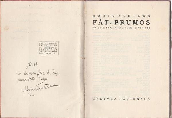 HORIA FURTUNA FAT-FRUMOS POVESTE LIRICA IN 4 ACTE AUTOGRAFATA CULTURA NATIONALA 1924 L5914 LEGATURA RIGIDA CON PIATTI MARMORIZZATI, DORSO MANCANTE, TAGLI SUPERIORI ROSSI, ALLA PRIMA PAGINA BIANCA E ALL'ANTIPORTA DEDICA E AUTOGRAFO DELL'AUTORE, COPIA N. 17 DI 40, INTERNO IN BUONO STATO N. PAG. 131 ALLA TERZA DI COPERTINA ETICHETTA ROTONDA CM. 19 X 14